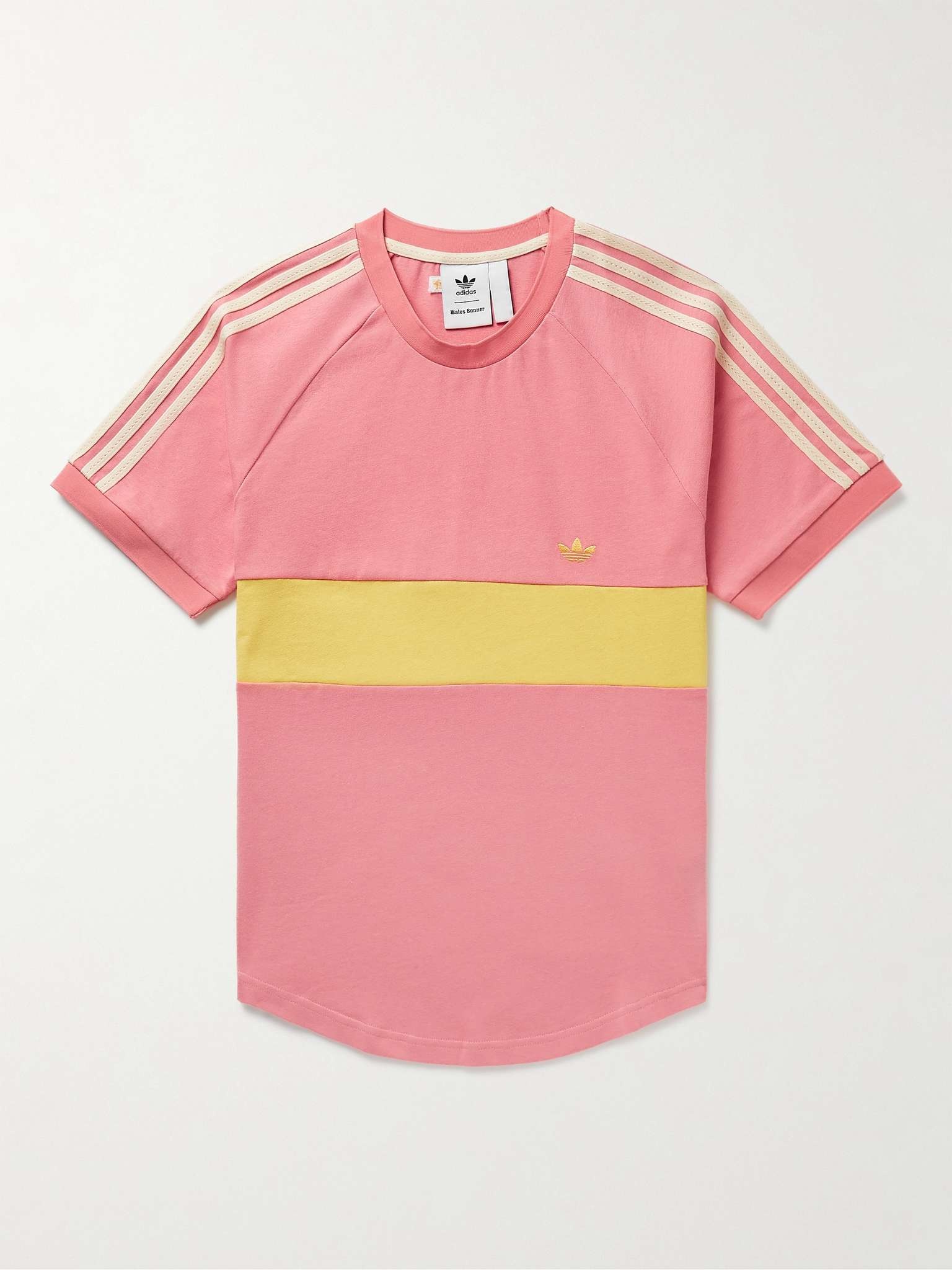 adidas Consortium continues its ongoing collaboration with Wales Bonner in this retro-inspired T-shirt. It's cut from organic cotton and features the brand's signature stripes and logo embroidery. Wear yours with shorts and trainers. Size & Fit - Fits true to size. Take your normal size - Those with a larger chest may wish to take the next size up - This T-shirt is designed for a regular fit - Mid-weight, stretchy fabric - Model wears a S - Model measures: chest 36"/ 92cm, height 6'2"/ 188cm Details & Care - Pink, yellow and cream organic cotton - 100% organic cotton - Machine wash - Designer colour: Tactile Rose - This item has been imported