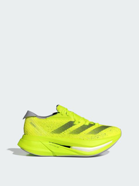 THE HIGH-STACKED RACE SHOE PACKED WITH PERFORMANCE-DRIVEN FEATURES. Built with innovative technology and designed without the constraints of world race regulations, the Prime X 2 Strung offers more performance-driven features in a single race shoe. It's constructed with a STRUNG upper, a textile innovation that transforms athlete data into a dynamic material tuned to the athlete's needs. Prime X 2 Strung also has 3 layers of LIGHTSTRIKE PRO, in a stack height of 50 mm. With an all-new energy core between two layers of foam, it helps to reduce weight and provide spring in the fore- and midfoot, so you can chase your fastest moment. An outsole featuring Continental compound delivers serious grip on a variety of surfaces. Details - Regular fit - Lace closure - STRUNG upper - Textile lining - Lightstrike Pro cushioning - Weight: 10.5 ounces (size 9) - Midsole drop: 7 mm (heel: 50 mm / forefoot: 43 mm) - Continentalâ„¢ Rubber outsole - Upper contains a minimum of 50% recycled content - Imported - Product code: IH5685 - Product color: Cloud White / Core Black / Lucid Red