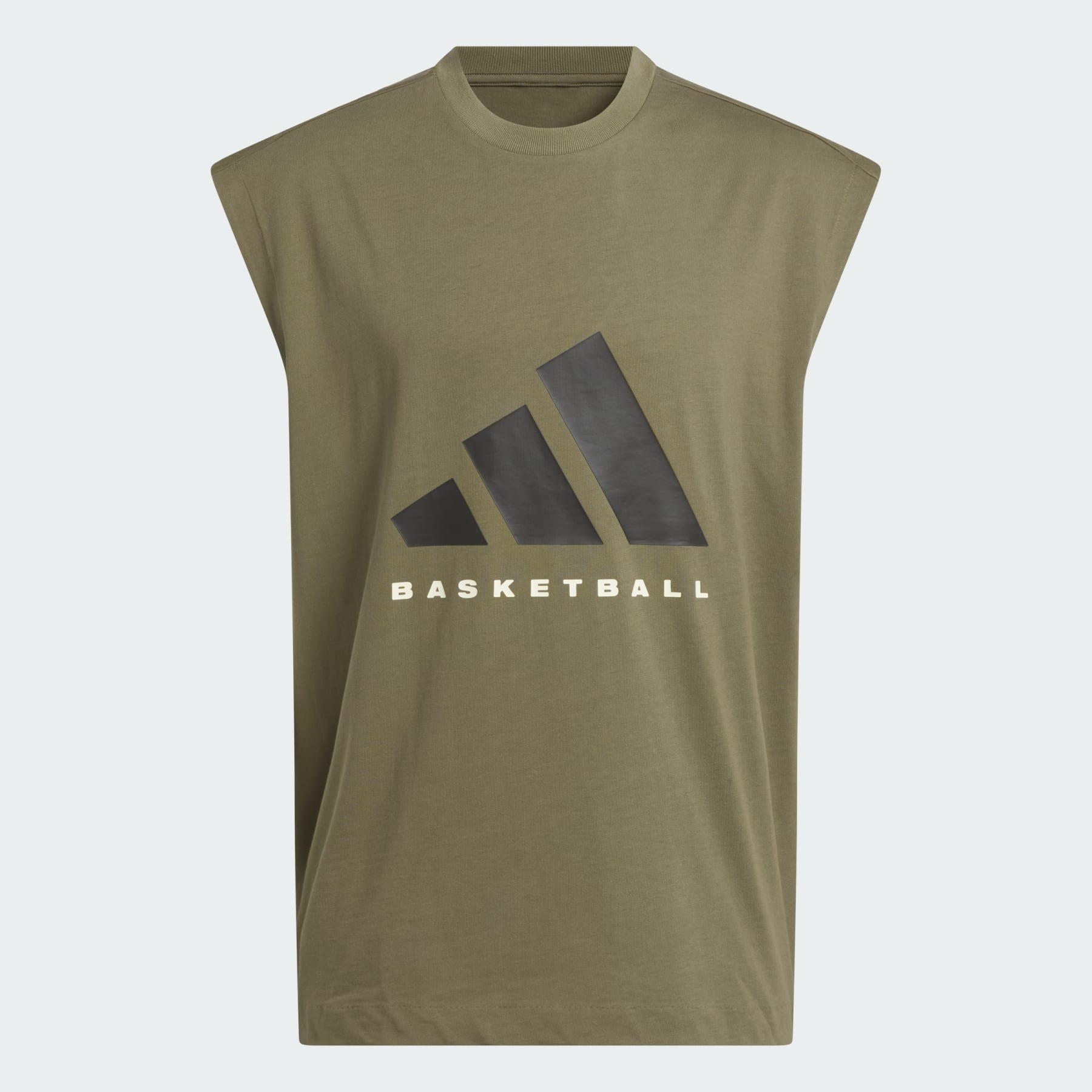 A sleeveless t-shirt for comfort on the basketball court. Power up your game in this adidas sleeveless basketball tee. The loose fit and sleeveless design give your arms full range of motion so you can get your shots off with ease. The large adidas Basketball 3 Bar logo on the chest shows your brand loyalty on the court. This tee was made using UNITEFIT — an all-gender fit system that was created with a spectrum of sizes, genders and forms in mind. Details - Loose fit - Ribbed crewneck - 100% cotton - Imported - Product code: JX5589 - Product color: Olive Strata