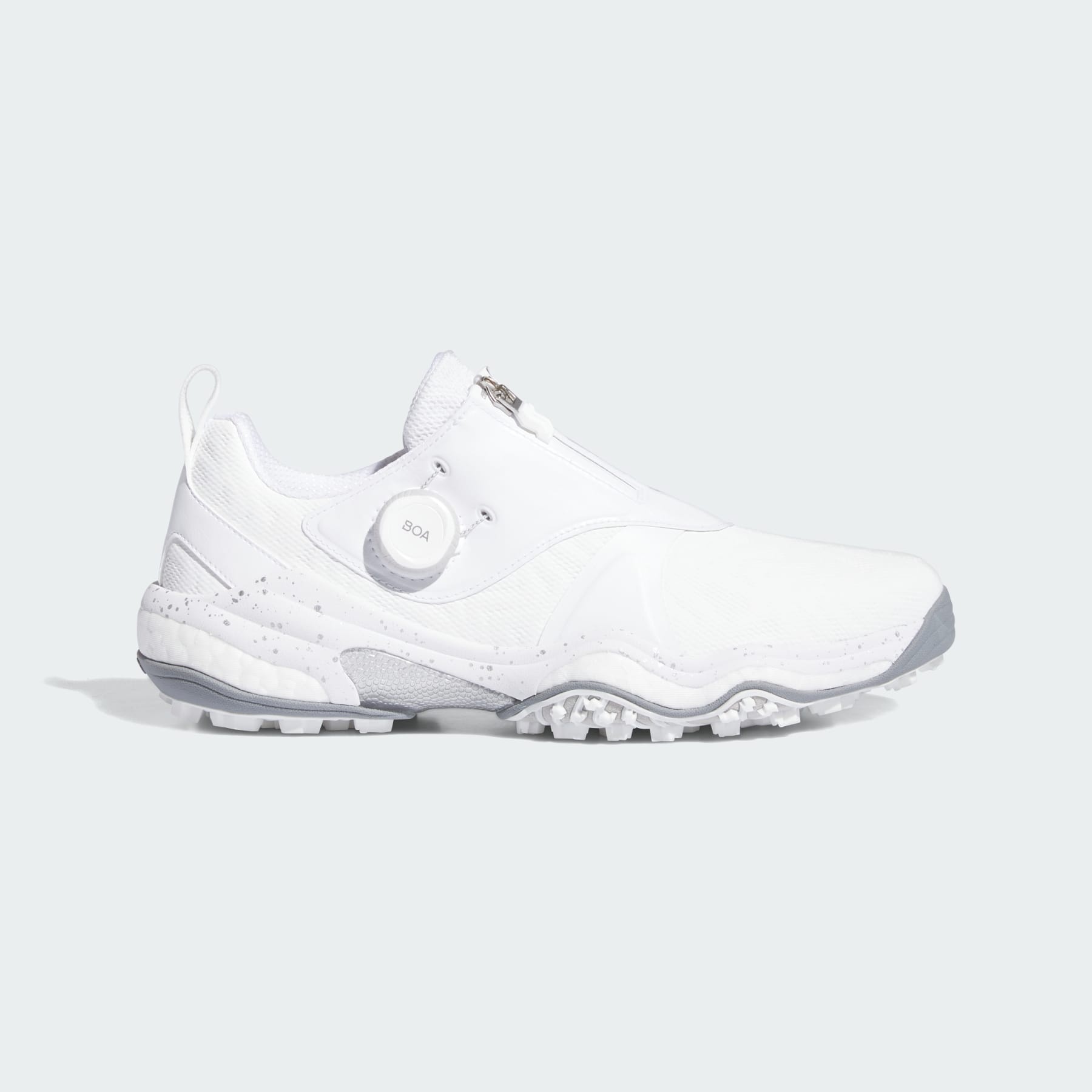 Laceless, performance golf shoes made in part with a blend of recycled and renewable materials. Supercharge your game. Supercharge your style. Shake up tradition in these Codechaos golf shoes from adidas. From the cushioned feel of Lightstrike + microfiber underfoot to the Twist Grip spikeless outsole that holds tight through your swing, these shoes offer tour-level performance while redefining golf style. They're finished off with a zipper shroud and the micro-adjustable BOA® Fit System that lets you fine-tune the fit with the twist of a dial. By choosing recycled, we are able to reuse materials that have already been created, which helps to reduce waste. Renewable materials choices will help us to remove our reliance on finite resources. Our products made with a blend of recycled and renewable materials feature at least 20% total of these materials. Details - Regular fit - Micro-adjustable dial-based BOA® Fit System - Multi-layered waterproof knit upper - Zipper shroud construction - Twist Grip - 3D TORSION System - Lightstrike + MICROFIBER combination midsole - INSITE® sockliner - Contains a minimum of 20% recycled and renewable content - Imported - Product code: ID8605 - Product color: Cloud White / Silver Metallic / Grey Two