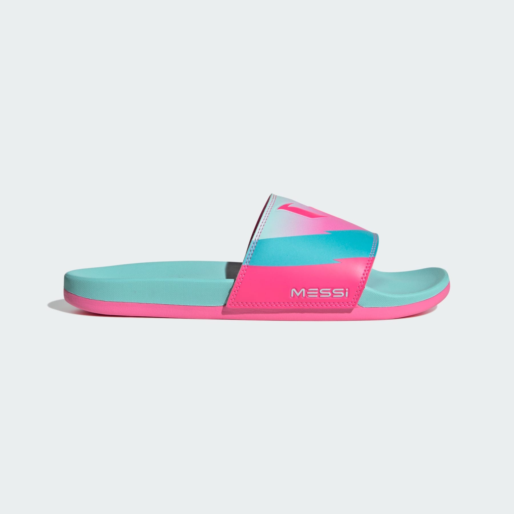 Comfortable, iconic slides with a Messi design. Whether you're unwinding after a game or winding up your day, these adidas slides are your go-to for easy comfort. The contoured footbed and textile lining keep your feet feeling good. With a signature graphic, these slides let you show your love for Messi. Details - Regular fit - Slip on - Quick-dry synthetic upper - Textile lining - Synthetic outsole - Imported - Product code: JR6326 - Product color: Flash Aqua / Lucid Pink / Lucid Cyan
