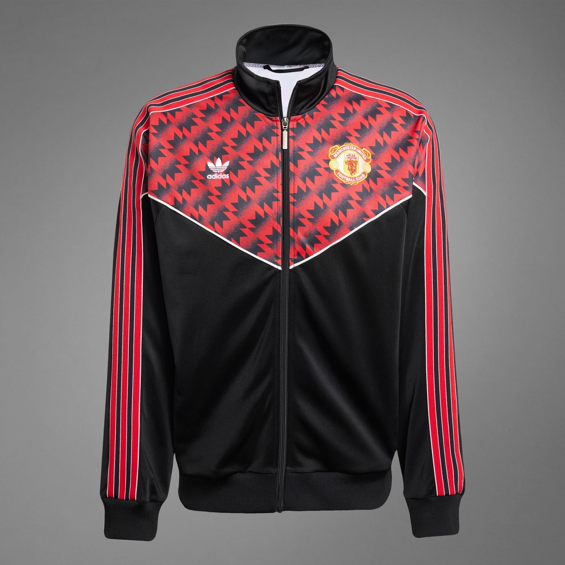 An eye-catching Man Utd track top from a memorable cup win. Manchester United became kings of Europe's cup winners in 1991 and this soccer track top is part of a collection commemorating that special victory. A one-for-one remake of the jackets worn during that memorable cup run, it comes in a loose fit. An adidas Trefoil and iconic "snowflake" design on the chest complete a look that stands the test of time. Details - Loose fit - Full zip with ribbed stand-up collar - 100% polyester (recycled) - Front pockets - Ribbed cuffs and hem - Manchester United crest - Imported - Product code: JF0373 - Product color: Black