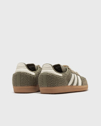 The Samba from adidas is no longer just what it originally was: a soccer shoe. The original model was designed in the late 1940s by adidas founder Adi Dassler. These were specially developed to give footballers more grip when they had to play on an ice-covered pitch. Since then, the Samba has become an integral part of the streetwear scene. This version impresses with its knit upper, high-quality suede details and a soft textile lining. The jagged 3-Stripes and the characteristic natural rubber outsole continue the legendary style. - Lace-up fastening - Textile and leather upper - Textile lining - Rubber outsole Article number: JR9447 Gender: men,women Color: ORBGRN/CREWHT/GUM3 Material: 30% Rubber, 70% Synthetic/Textile