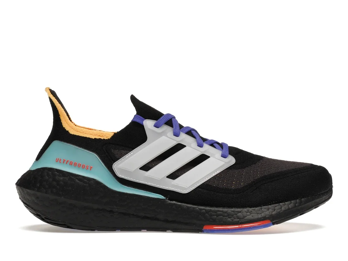 The adidas Ultra Boost 21 Pulse Aqua Black is designed to pop with color, enhance your running performance, and reduce plastic waste in production. The Pulse Aqua Black adidas Ultra Boost 21 features an upper constructed of black Primeknit and Primeblue, a flexible fabric using 100% recycled polyester and recycled Parley Ocean Plastic. Blue synthetic forms a sturdy heel counter with red Ultra Boost branding, and translucent white synthetics are used to form the iconic adidas side-panel three stripes that integrate into the eye stays. Red adidas branding on the tongue, purple laces, and yellow edging around the collar and heel complete the vibrant look of this upper. The black midsole is constructed of Ultra Boost for a soft landing and propulsive energy return with every step, and it incorporates a Torsion System to increase forefoot flexibility. Our favorite aspect of this many-hued shoe is its most colorful part: the dynamic outsole. Lugged black rubber circles the outer foot, surrounding a loop of purple rubber, undulating red rubber strips, and a forefoot rubber pod in bright yellow. The adidas Ultra Boost 21 Pulse Aqua Black was released on June 17, 2021, for $180 retail. - Style S23870 - Colorway Core Black/Cloud White/Pulse Aqua - Retail Price 180 - Release Date 2021-06-17 - Featured false - Product Line adidas Ultra Boost