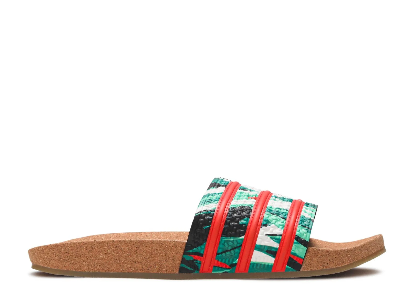 Part of the Tropical Pack, the Adilette Slides 'Cork' released in July 2020. The shoe's polyurethane bandage upper sports a leaf-style pattern throught its construction, highlighted by Energy Orange Three-Stripes. A textile lining is included for comfort, while underfoot, the genuine cork sole unit includes a contoured footbed. A gum rubber outsole is included for traction. SKU: FZ4128 Colorway: Cloud White/Energy Orange/Core Black Release Date: 7/15/20