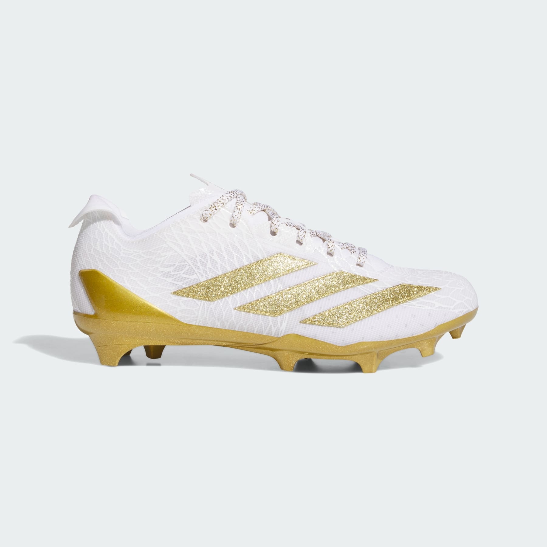 Supportive football cleats made in part with recycled materials. These football cleats are built specifically for players who break the game wide open with their speed. They feature a lightweight synthetic and textile upper that won't slow you down and they have a cleated outsole for outstanding traction on plants and cuts. A TPU heel clip provides additional critical support. This product features at least 20% recycled materials. By reusing materials that have already been created, we help to reduce waste and our reliance on finite resources and reduce the footprint of the products we make. Details - Regular fit - Lace closure - Synthetic and textile upper - Textile lining - Synthetic cleated outsole - Contains at least 20% recycled content - Imported - Product code: JH6254 - Product color: Cloud White / Gold Metallic / Cloud White