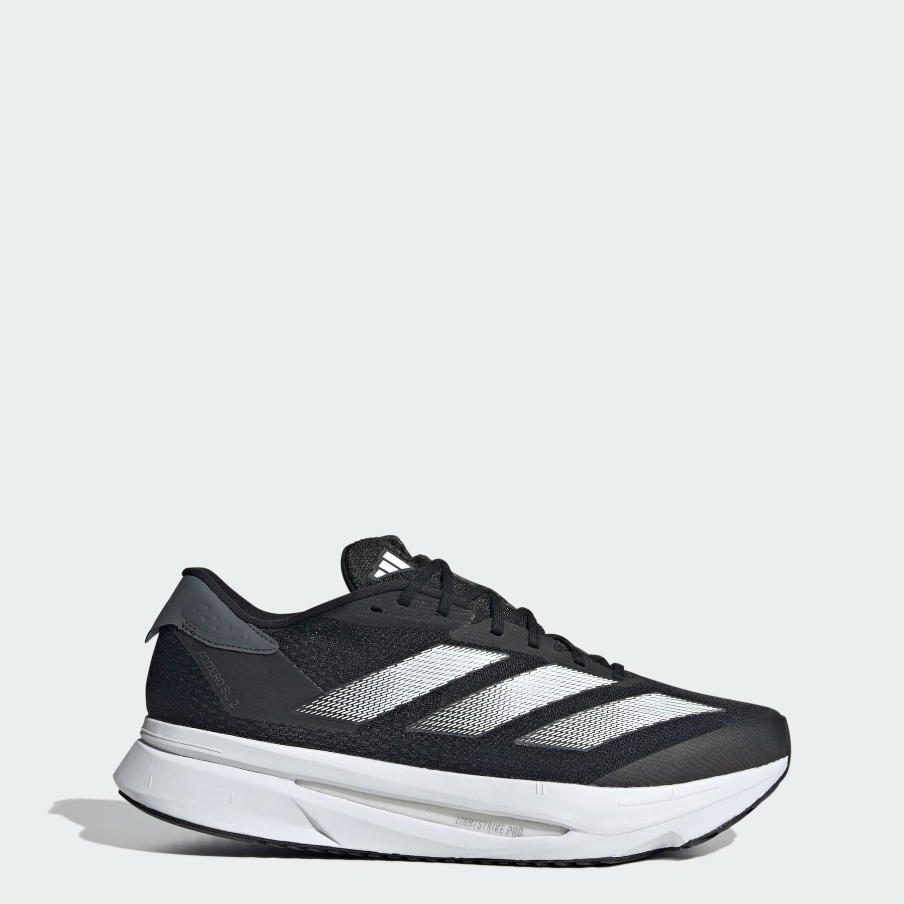 Lightweight running shoes made in part with recycled materials. Experience the thrill of breaking personal records in a shoe that's as fast as you are. These adidas Adizero running shoes are equipped with responsive Lightstrike Pro, super-light cushioning that delivers energy return for next-level speed. The engineered mesh upper provides breathability and targeted support where you need it most to keep you flying to the finish. This product features at least 20% recycled materials. By reusing materials that have already been created, we help to reduce waste and our reliance on finite resources and reduce the footprint of the products we make. Details - Wide fit - Lace closure - Mesh upper - Textile lining - Lightstrike Pro cushioning - All-surface rubber outsole - Weight: 8.4 ounces (size 9) - Midsole drop: 9.5 mm (heel: 36.9 mm / forefoot: 27.4 mm) - Imported - Product code: IF1181 - Product color: Core Black / Cloud White / Carbon