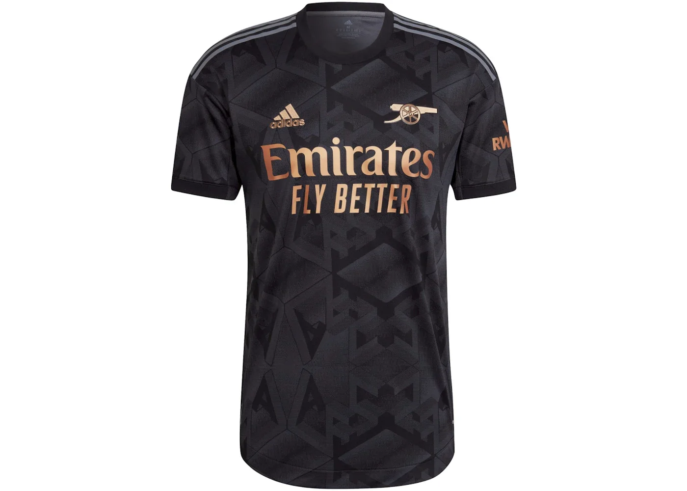 The adidas Arsenal 22/23 Away Authentic Jersey Black pays tribute to the AFC (the Arsenal Football Club) out of London. The Black adidas Arsenal 22/23 Away Authentic Jersey has a color combination of black and Old Gold lettering that is stylish and sophisticated. Old Gold is one of the AFC team colors along with red, blue, and white. It also gives a nod to the Emirates Stadium (home of the AFC team) and Emirates Airlines. For example, the Emirates name and the airline's "Fly Better" slogan are prominently displayed under the adidas logo. Made of 100% polyester and treated for cooling and breathability, it is comfortable to wear year-round. Our team appreciates the many classic team features of the adidas Arsenal 22/23 Away Authentic Jersey Black, such as the cannon logo or crest and the "Visit Rwanda" message on its left sleeve. adidas released this team jersey in the Spring/Summer of 2023. It originally sold for $150. - Season SS23 - Color Black - Style H35901 - Retail Price 150 - Featured false - Uploaded By RK