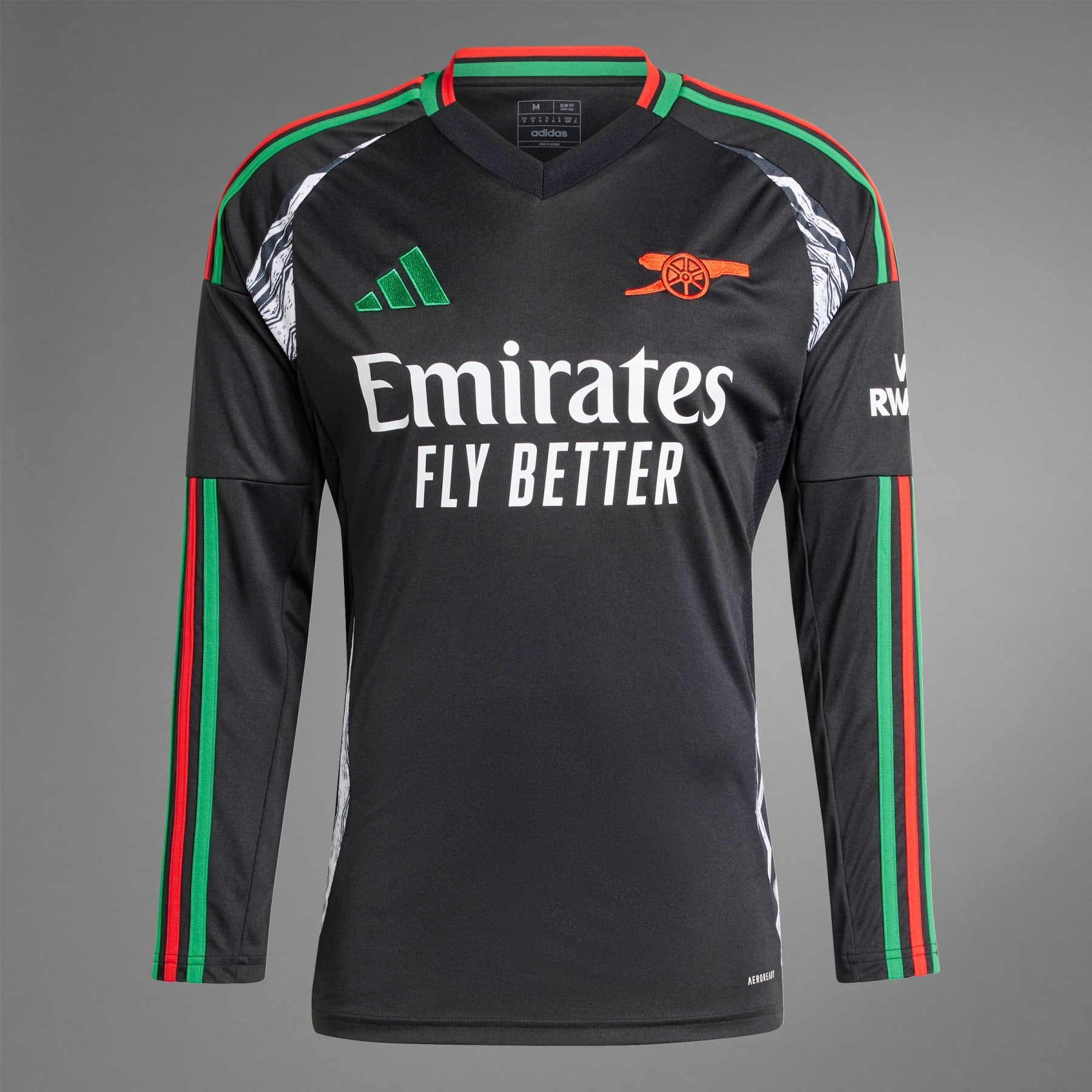A bold fan jersey designed with Labrum London and made with recycled materials. An expression of pride in Arsenal's diverse fanbase. Showing off Labrum London's signature West African influences, this adidas jersey is part of a collaboration with the British fashion brand. Intricate graphics and details in the colors of the Pan-African flag combine for an eye-catching look. A premium team badge, long sleeves and moisture-managing AEROREADY make it perfect for devoted soccer supporters.This product is made with 100% recycled materials. By reusing materials that have already been created, we help to reduce waste and our reliance on finite resources and reduce the footprint of the products we make. Details - Slim fit - Flat-knit collar with V-neck - 100% polyester (recycled) - AEROREADY - Arsenal embroidered crest - Imported - Product code: IS8135 - Product color: Black