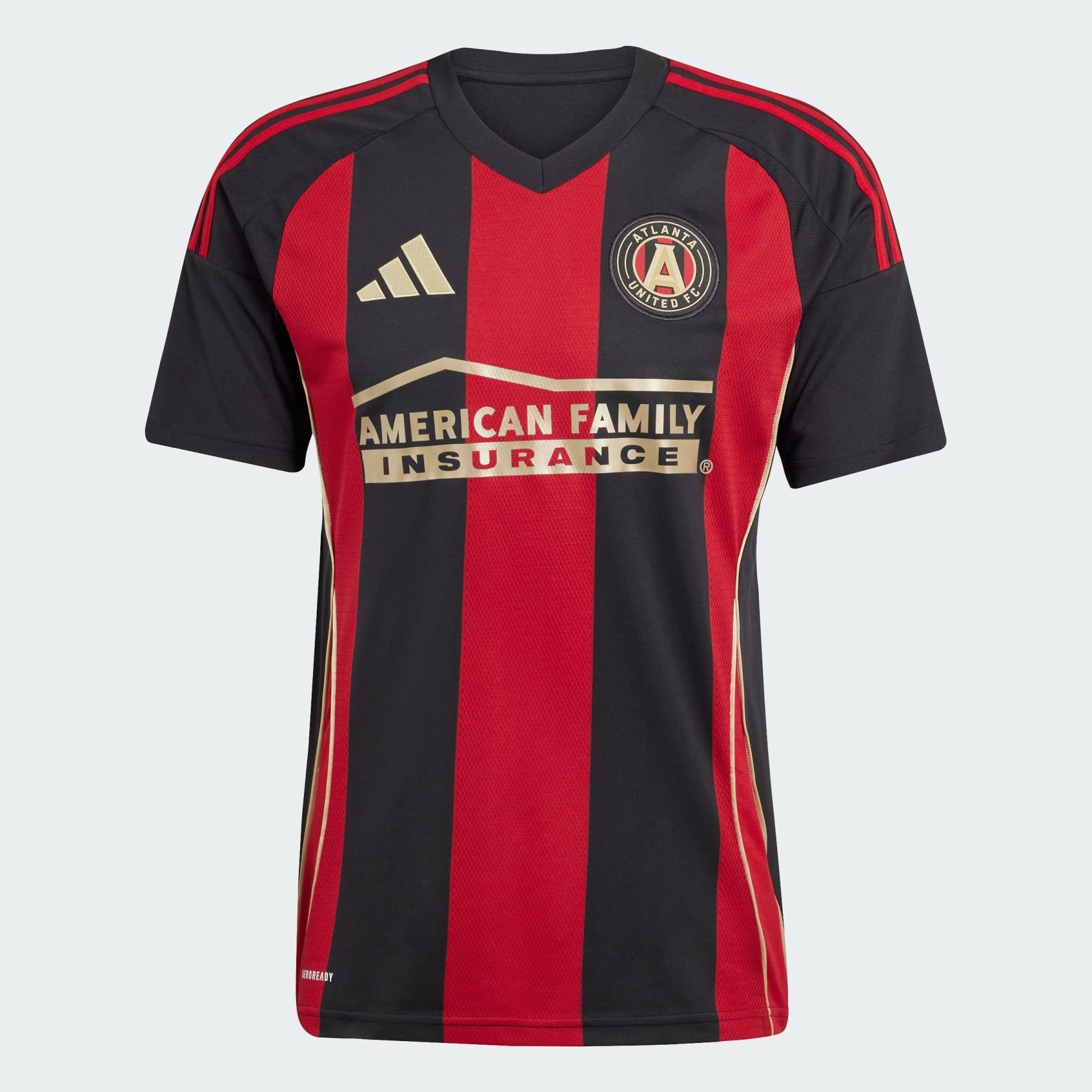 A fan jersey with ATL UTD's iconic stripes, made with recycled materials. 5-Stripes. Five pillars that represent Atlanta United FC's identity. The adidas jersey fans wear at the Mercedes-Benz Stadium, this soccer top displays ATL UTD's famous red and black home kit design. With soft fabric and golden details, it feels as good as it looks. A sewn-on club crest and "Atlanta United" back-neck sign-off show you belong. This product is made with 100% recycled materials. By reusing materials that have already been created, we help to reduce waste and our reliance on finite resources and reduce the footprint of the products we make. Details - Slim fit - V-neck - 100% polyester (recycled) - AEROREADY - Mesh side panels - Atlanta United FC sewn-on crest - Imported - Product code: IV5075 - Product color: Black / Team Victory Red