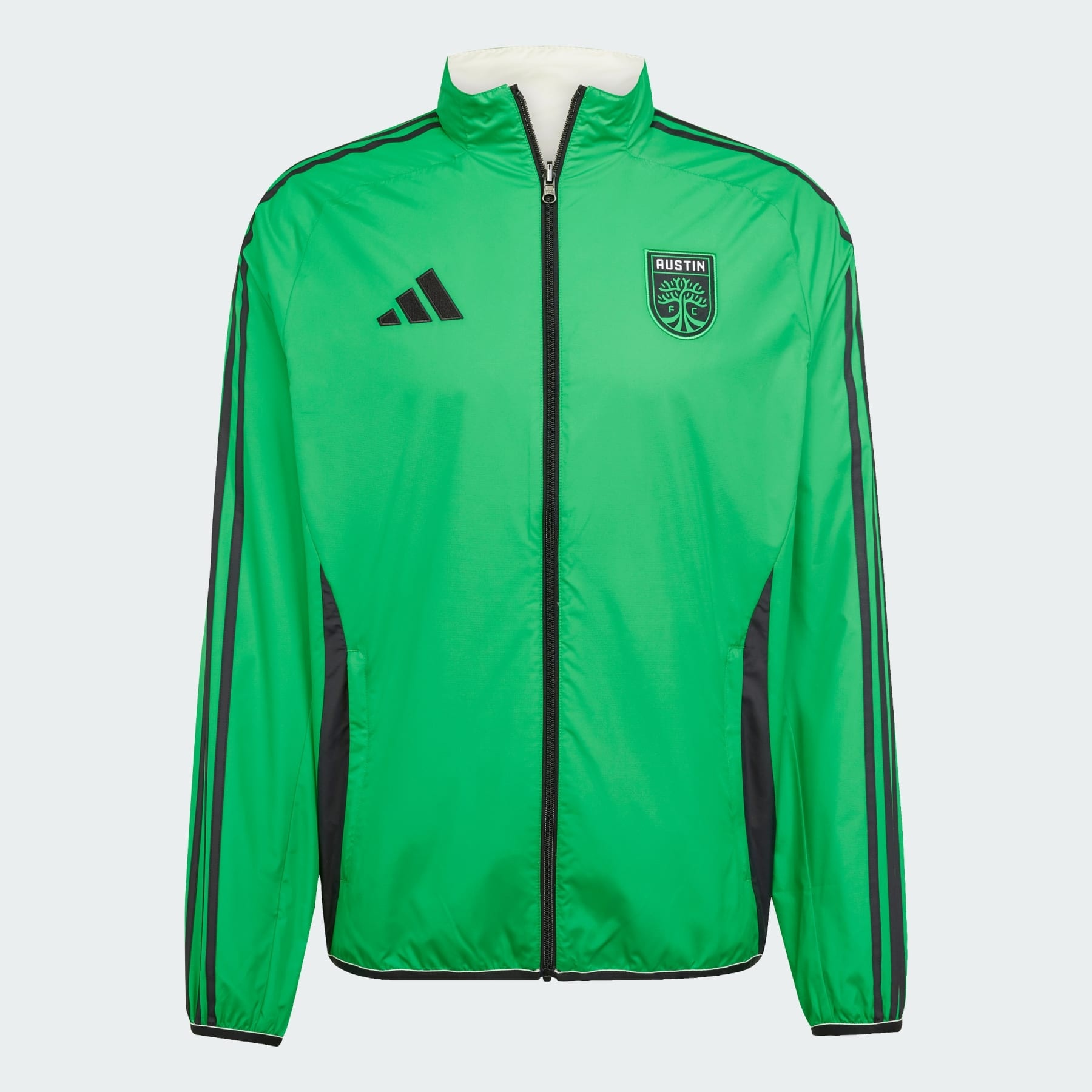 Choose your look in this Austin FC jacket made with recycled materials. Stand shoulder-to-shoulder with Austin FC players in the adidas anthem jacket they wear as they enter the field. This reversible soccer top offers home and away colors, letting fans choose how they want to show their support. Whichever way you wear it, a club badge will always be on show. This product is made with 100% recycled materials. By reusing materials that have already been created, we help to reduce waste and our reliance on finite resources and reduce the footprint of the products we make. Details - Slim fit - Full zip - 100% polyester (recycled) - Lined - Outer: Austin FC woven crest - Inner: Austin FC screenprinted crest - Imported - Product code: JE5618 - Product color: Real Green