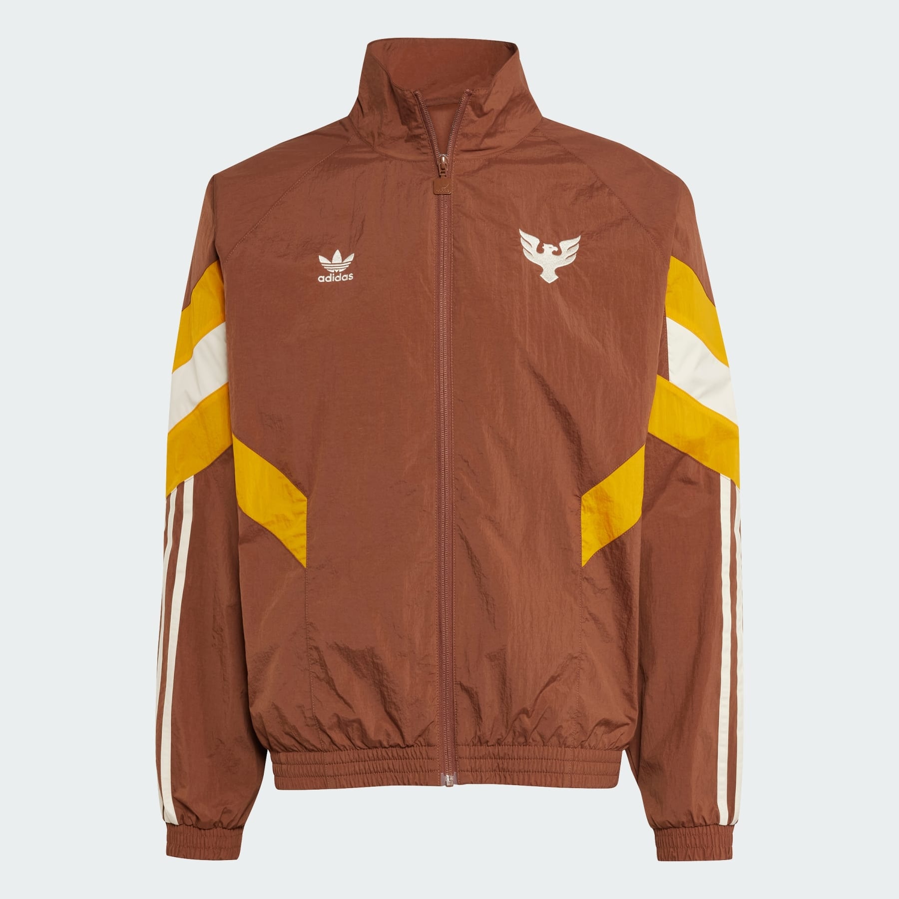 A timeless adidas track top for D.C. United fans, made with recycled materials. Represent D.C. United in adidas style. This track top rolls back the years, making it the ideal option when you want to stand out from the match day crowd. On the chest, a Trefoil joins a simplified club crest for an eye-catching soccer look. This product is made with 100% recycled materials. By reusing materials that have already been created, we help to reduce waste and our reliance on finite resources and reduce the footprint of the products we make. Details - Loose fit - Full zip with stand-up collar - 100% polyamide (recycled) - Front zip pockets - Mesh lining - Elastic cuffs and hem - D.C. United crest - Imported - Product code: JF2678 - Product color: Preloved Brown