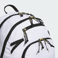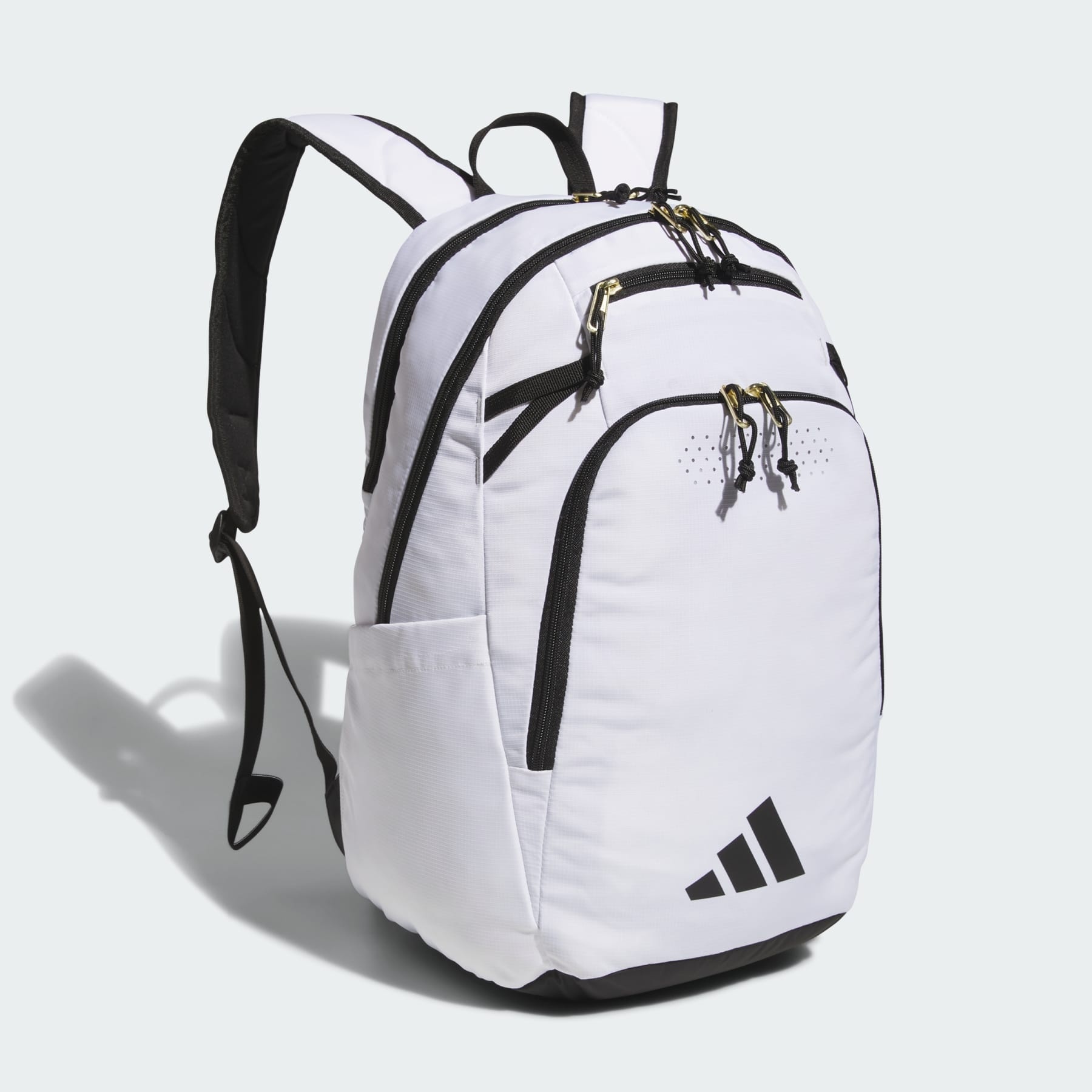 This backpack has all the storage you need for daily activities. The Defender 5 Backpack keeps your hands free, so you can stay focused when you're heading to practice, a game or school. It's built to last from durable polyester with a water-resistant base and webbing attachment points to clip keys, a water bottle or other essentials. There's a large main area and multiple zippered pockets, including a vented pocket for dirty clothes. Details - Dimensions: 12.5" x 9.25" x 19.5" - 100% polyester - Zip pocket with ventilation - Water-resistant base material - Plenty of room for team branding - Webbing attachment points - Multiple zip pockets - Lifetime warranty - built to last - Imported - Product code: JJ7521 - Product color: White / Gold Metallic / Black