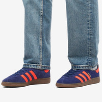 Adidas showcases its German roots with the Munchen sneakers. Designed to a deep navy colourway with contrasting solar red overlays on the 3-Stripes and the heel cover, they're an archived favourite. Made with recycled materials as adidas continues to reduce waste as part of its sustainability campaign. - Suede Uppers - Leather Overlays - Leather Lining - Rubber Outsole - Tongue Branding