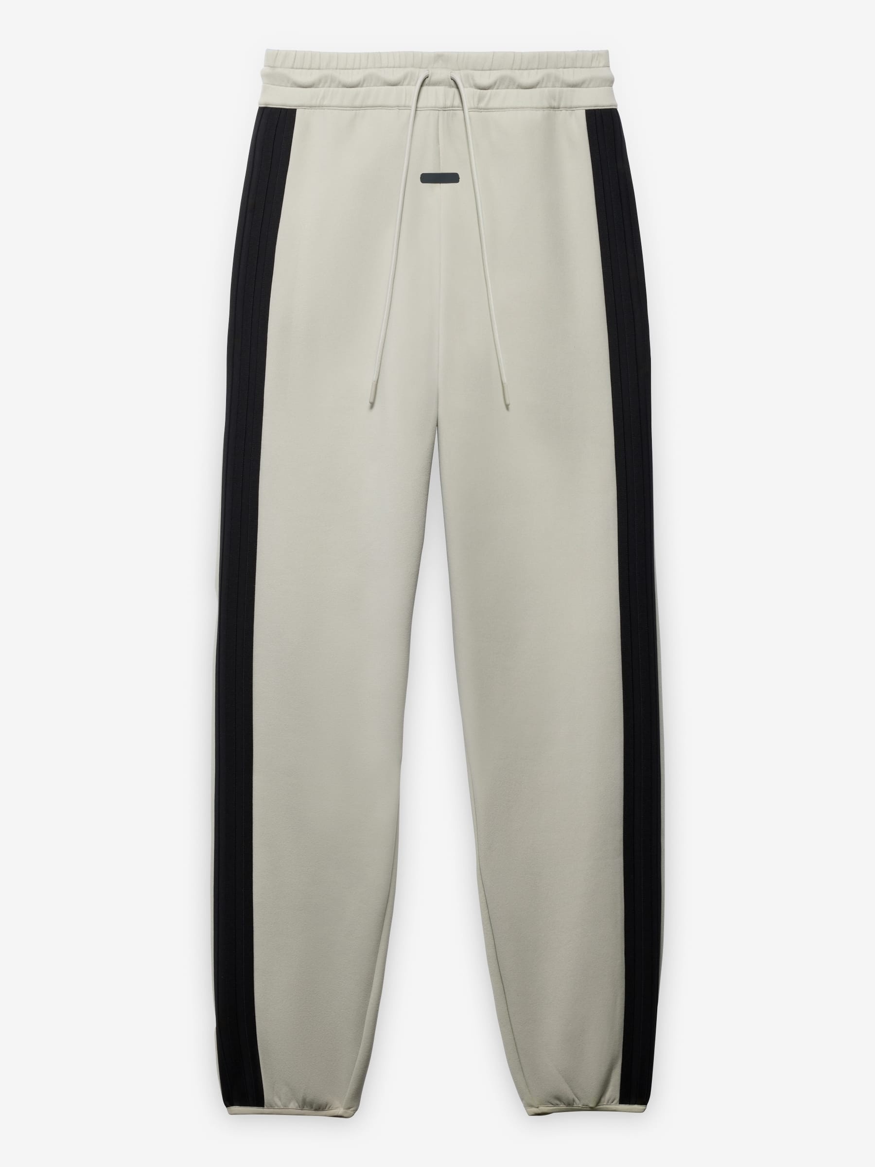 Suede fleece pants from Fear of God Athletics. The Athletics Suede Fleece Sweat Pants are elevated in a heavy doubleknit fabric to provide structure and comfort with a rich, brushed texture. Signature adidas 3-Stripes side panels frame the relaxed fit silhouette. Functional details include an elastic waistband with a drawcord, side seam pockets with a perforated four-way stretch lining and a bottom hem with elastic binding. A sueded black bar label on the center front defines minimalist branding. Details - Relaxed fit - 92% recycled polyester, 8% elastane doubleknit - Signature adidas 3-Stripes side panel - Elastic waistband with drawcord - Side seam pockets with perforated four-way stretch lining - Bottom hem with elastic binding - Sueded black bar label on center front - Imported - Product code: IS5328 - Product color: Sesame