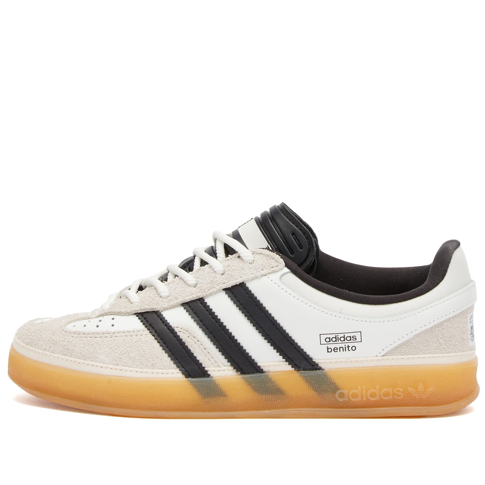 Continuing their creative partnership, adidas x Bad Bunny have turned their attention to the Gazelle Indoor Sneakers, an iconic silhouette for everyday wear. The ‘Off White’ iteration sees the introduction of short hair suede panels over smooth leather uppers for texture. The adidas 3-Stripe slashes through the sidewall accompanied by a minimal co-branded stamp in the same colour. An unbranded tongue and perforations at the T-toe round things off, a perfect blend of the familiar and the unconventional. - Leather Uppers - Short Haired Suede Overlays - Gum Rubber Midsole - Perforated Detail - Asymmetric T-Toe - Lace Up Closure - Side Logo Stamp - Serrated 3-Stripes