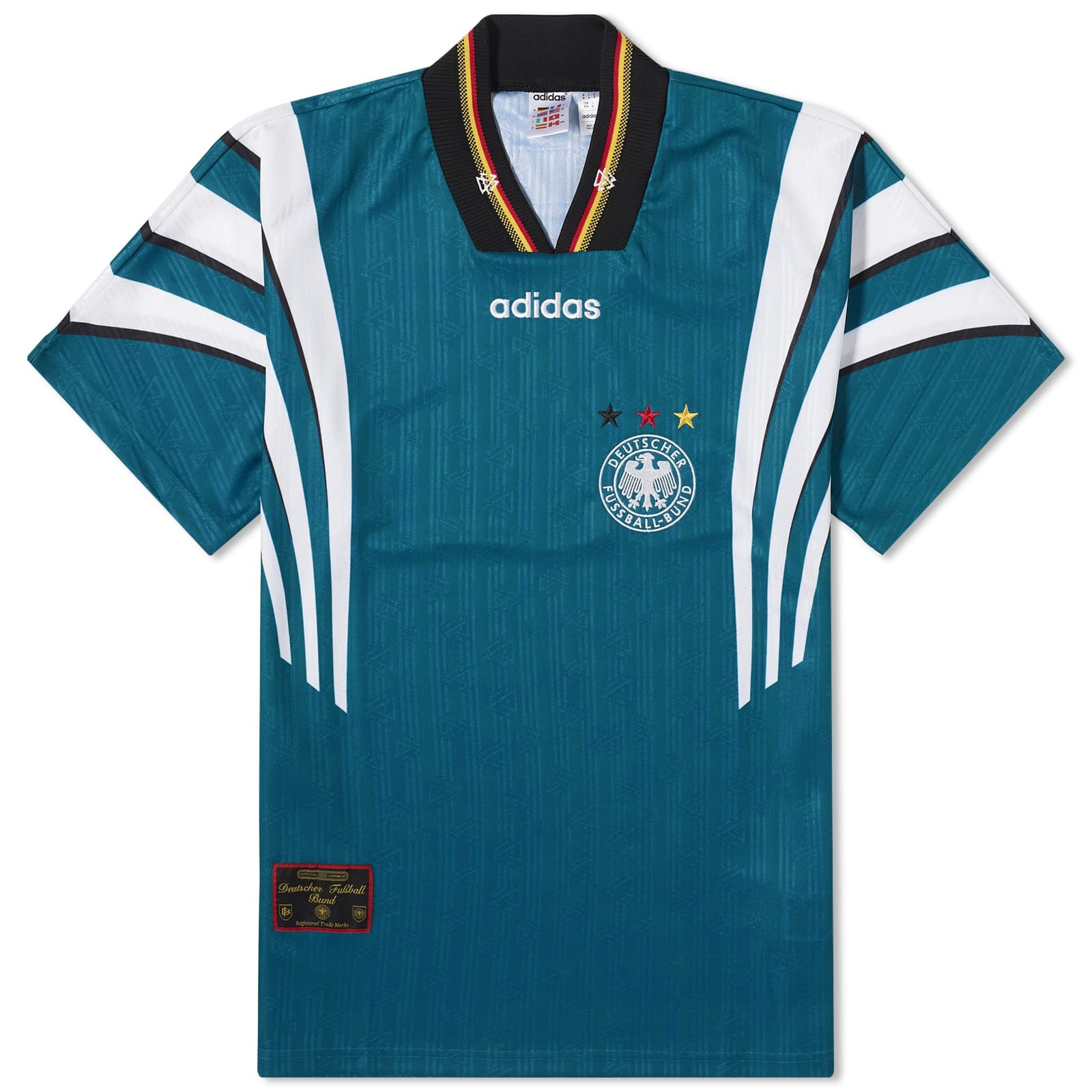 Ahead of Euro 2024 in Germany this summer, adidas takes a step back in time to the countries glory days with the Away Jersey from 96. Donned when Berti Vogts side became European Champions for a third time, this kit is designed with an era-evoking loose fit cut whilst 3-stripes curving down from the shoulders create a striking contrast. Blending 90s nostalgia and football style, this jersey is finished with a federation badge etched onto the chest. - 100% Recycled Polyester Jacquard - Ribbed V-Neck - Embroidered Branding