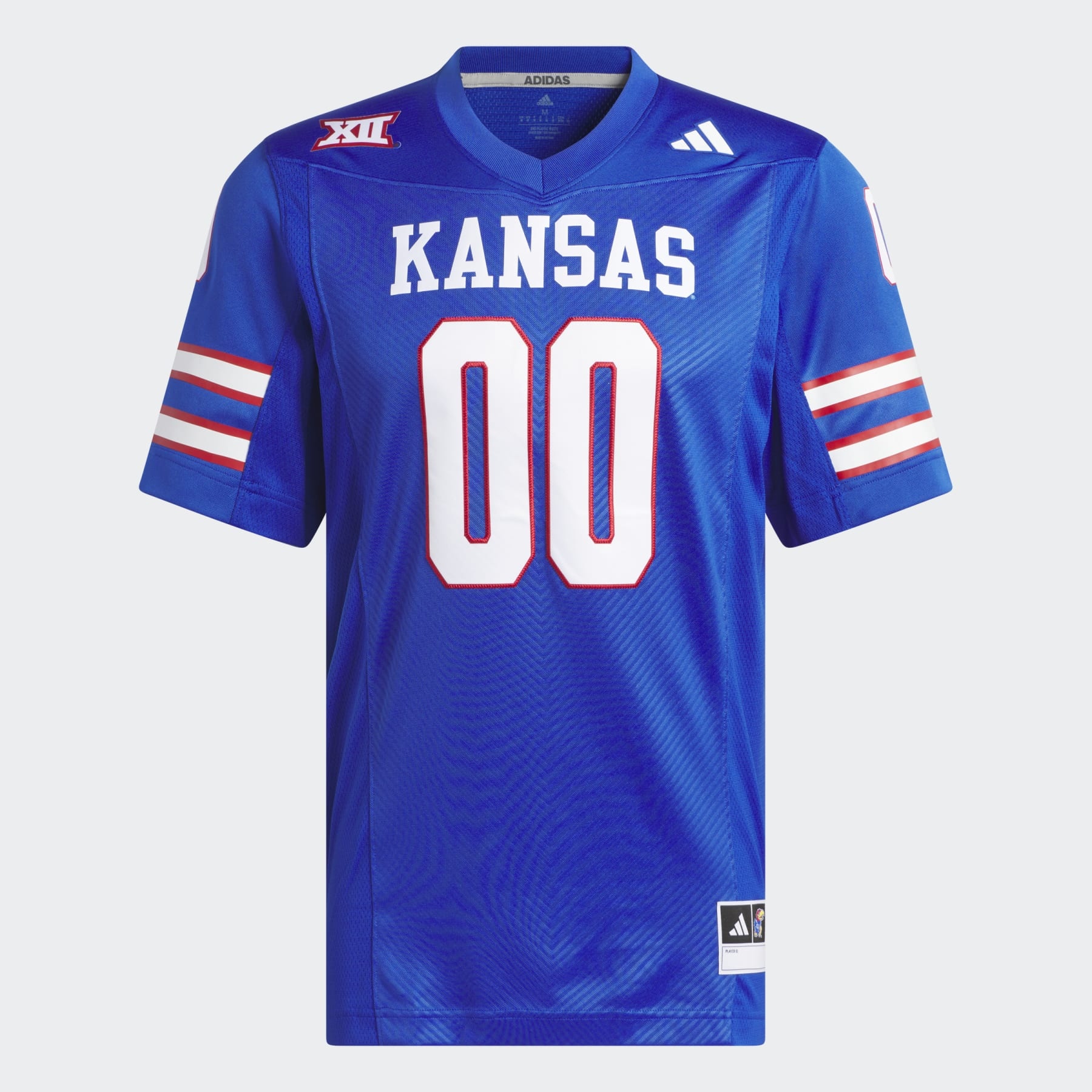 An off-field jersey for Jayhawks fans, made with recycled materials. Get ready to root for the Jayhawks in this adidas football jersey. It's made of comfortable fabric and has mesh panels to keep it breathable at all times. Fire up the grill or kick back with friends while you watch the game. The University of Kansas colors let everyone know who you support. Made with 100% recycled materials, this product represents just one of our solutions to help end plastic waste. Details - Regular fit - Ribbed V-neck - Main: 100% polyester (recycled) - Shoulders and sleeves: 100% polyester (recycled) - Mesh lower sleeves and side panels - Side slits on droptail hem - Jayhawks sewn-on crest - Number on back - Imported - Product code: IA3353 - Product color: Royal Blue