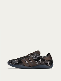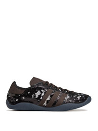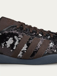 Karintha Sequin Lo Sneakers in Dark Brown from Adidas Originals x Wales Bonner Highlights - dark brown - full sequins upper - satin 3 stripes - lace closure - rubber soles Made in China Designer ID: JR0259 Colour ID: Core Black / Silver Metallic / Dark Brown Please note: One pair of shoes per customer Materials Main Material: TEXTILE Lining Material: TEXTILE Outsole Material: RUBBER Insole Material: TEXTILE