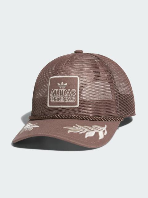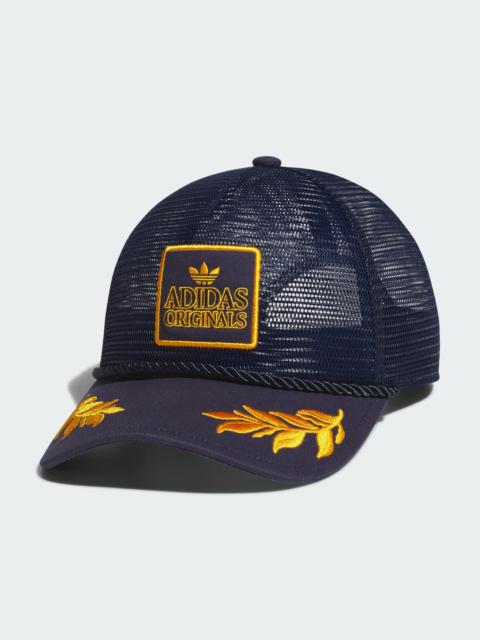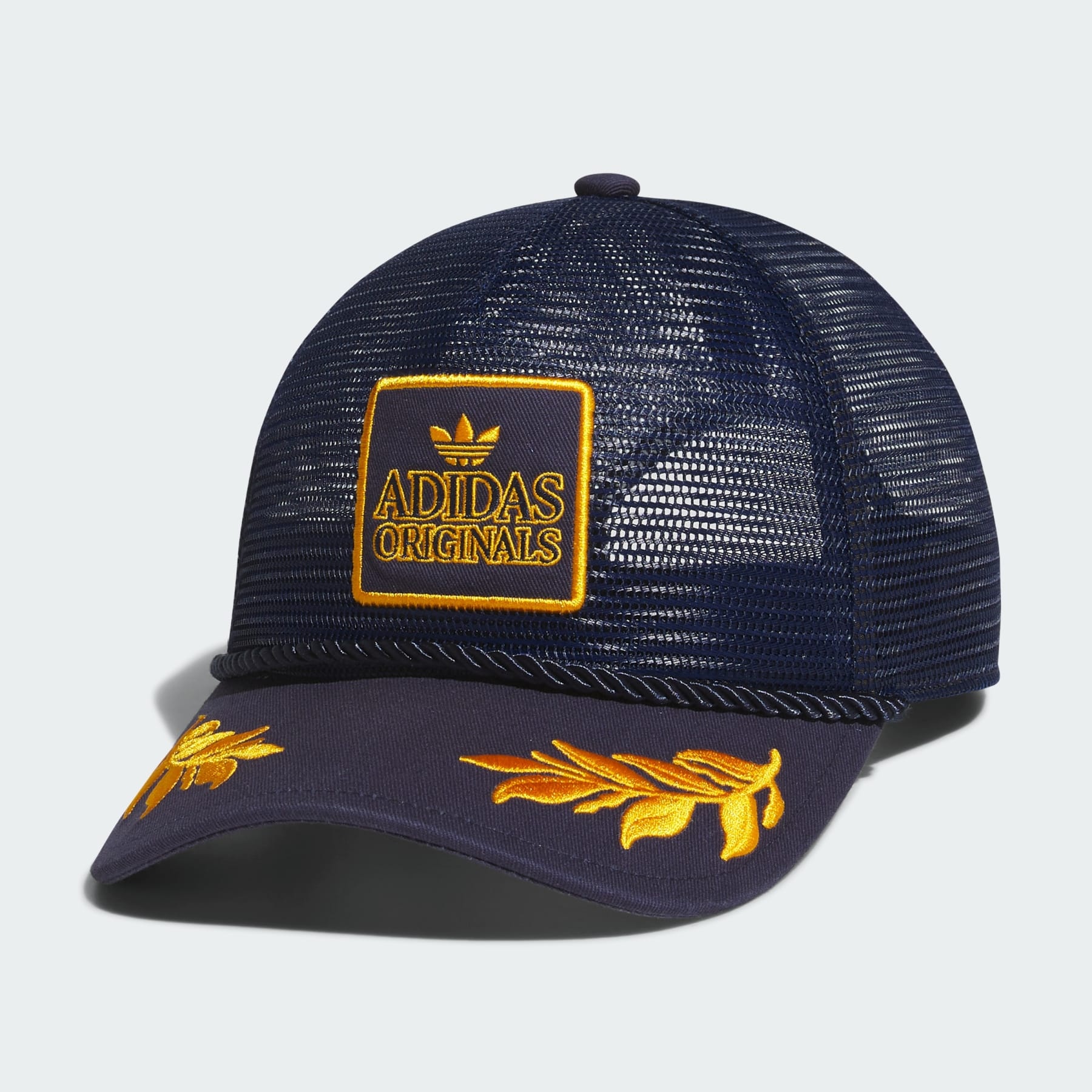 A comfortable trucker hat for everyday wear. Like a classic trucker hat, only airier. This hat from adidas Originals goes with the (air) flow thanks to an all-mesh six-panel crown. An embroidered patch and brim decor jazz up the look. Snaps in back adjust to lock in the right fit for your head. Details - 100% polyester - Graphic embroidered patch on front panels - Rope attached on brim - Snapback closure - Medium pre-curved brim - Full mesh six-panel crown - Imported - Product code: JJ7501 - Product color: Night Indigo / Collegiate Gold