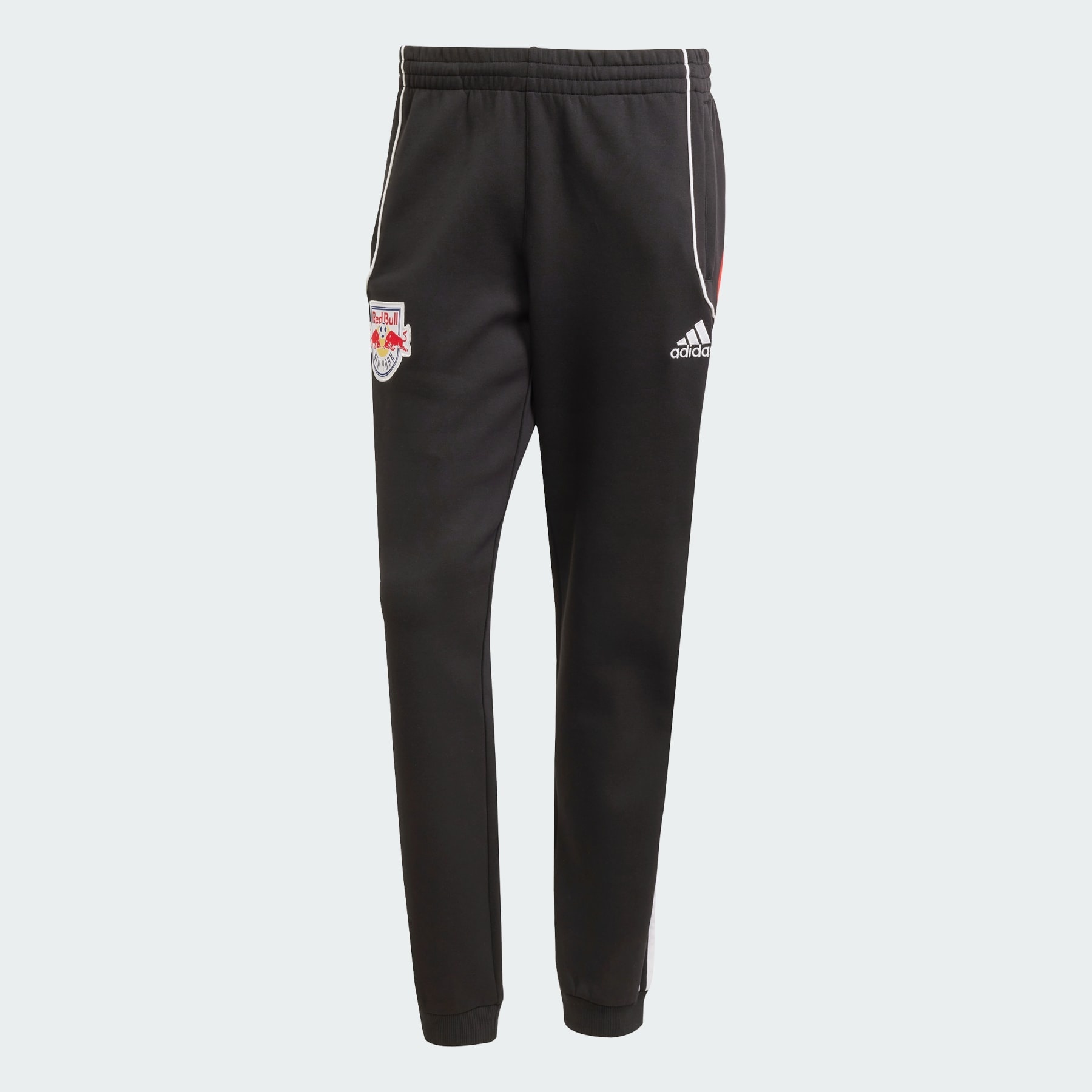 Red Bulls travel pants designed with 2010s soccer style. Built for everyday wear, these adidas New York Red Bulls pants are a must-have for any fan. Their 2010s-inspired design includes contrast piping, bold 3-Stripes down the legs and a woven team crest that shows your loyalty. Soft doubleknit fabric and handy ankle zips ensure they're a comfortable option for hectic lives. Details - Regular fit - Elastic waist with drawcord - 66% cotton, 34% polyester (recycled) - Side pockets - Ankle zips - Elastic cuffs - New York Red Bulls woven crest - Imported - Product code: JE8065 - Product color: Black