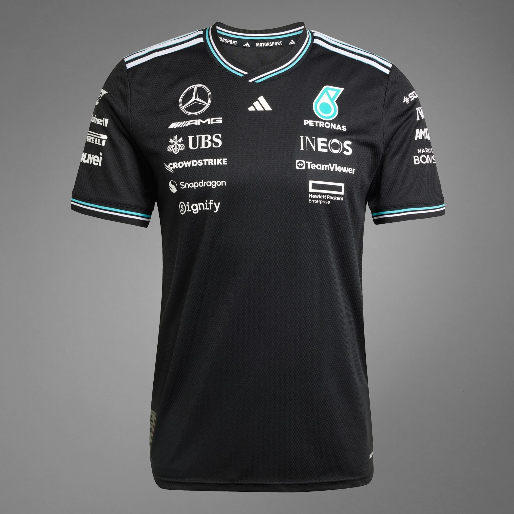 An official driver jersey from adidas Motorsports, made with recycled materials. Look and feel like you're ready to take the wheel in this driver jersey from adidas. Built just like the ones worn on race day, this jersey features AEROREADY to manage moisture, providing both outstanding performance and elevated comfort. Mercedes - AMG Petronas Formula One Team logo branding and sponsor logos make the look authentic, while 3-Stripes on the shoulders and the 3 Bar Logo on the chest offer a signature adidas signoff. This product is made with 100% recycled materials. By reusing materials that have already been created, we help to reduce waste and our reliance on finite resources and reduce the footprint of the products we make. Details - Regular fit - Crewneck - 100% polyester (recycled) - AEROREADY - Mercedes - AMG Petronas Formula One Team logo - Imported - Product code: JY2607 - Product color: Black / White