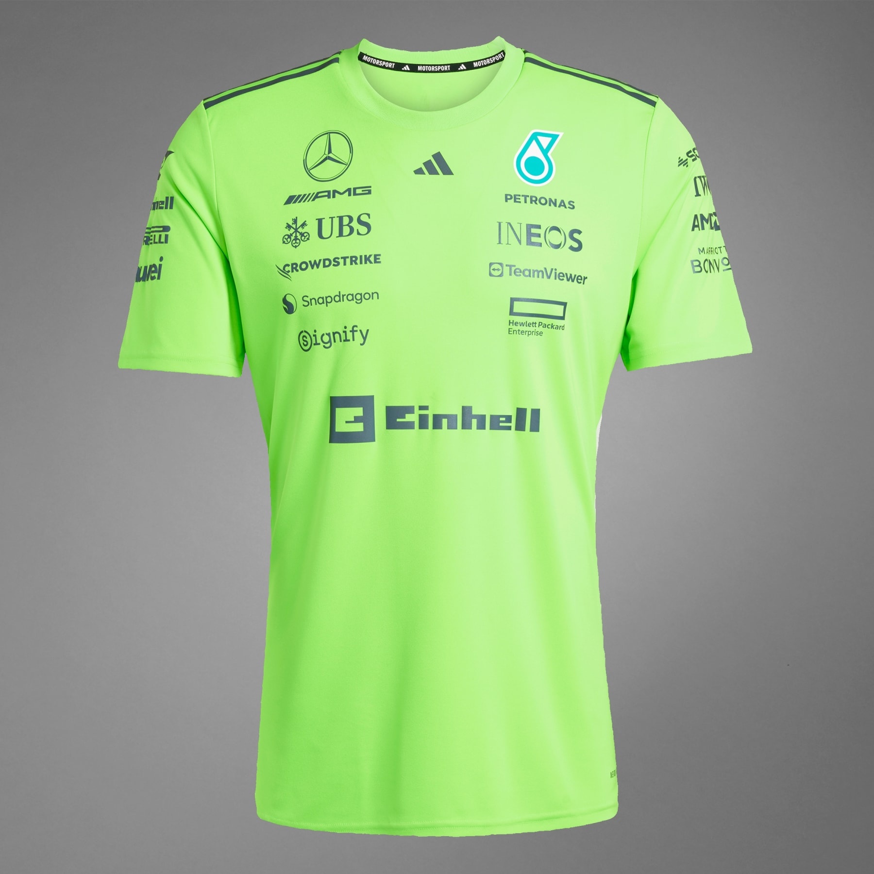 A team tee for set-up day, made with recycled materials. Rev your engines in this Mercedes - AMG Petronas Formula One Team set-up tee from adidas Motorsports. The bold team and sponsor logos across the front proudly display your devotion, while moisture-managing AEROREADY keeps you cool and comfortable. This t-shirt is modelled after the one worn by the team as they get set up for racing. This product is made with 100% recycled materials. By reusing materials that have already been created, we help to reduce waste and our reliance on finite resources and reduce the footprint of the products we make. Details - Regular fit - Ribbed crewneck - 100% polyester (recycled) - AEROREADY - Mercedes - AMG Petronas Formula One Team logo - "Petronas" on back - Imported - Product code: JZ7402 - Product color: Solar Green / Black