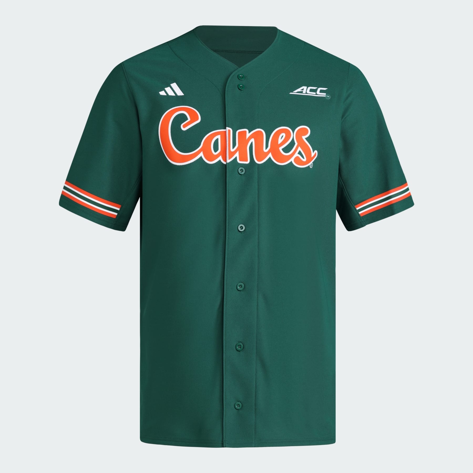 A Hurricanes baseball jersey made with recycled materials. Show off your school pride during baseball season and every other season too in this Miami jersey from adidas. It's made of durable polyester and features a full button front for an authentic look. Hurricanes graphics on the chest complete the look. This product is made with 100% recycled materials. By reusing materials that have already been created, we help to reduce waste and our reliance on finite resources and reduce the footprint of the products we make. Details - Regular fit - Button front - 100% polyester (recycled) - Hurricanes graphic - Imported - Product code: JJ2385 - Product color: Dark Green