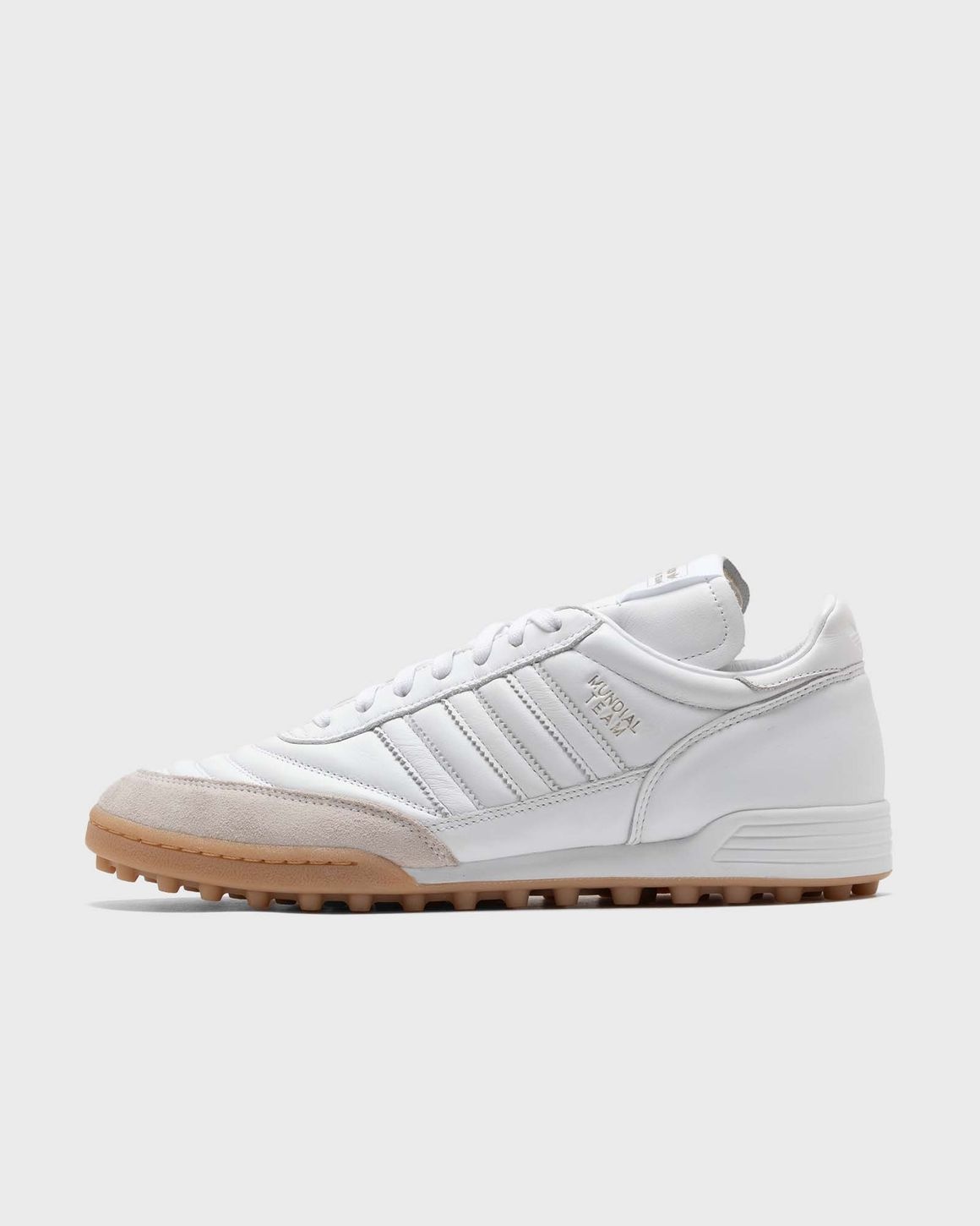 The adidas Mundial Team sneakers are crafted for comfort, with a premium leather and suede upper that is pre-shaped for an improved fit. The soccer-inspired silhouette features the classic Mundial Team logo alongside 3-Stripes, suede overlays and a longer-than-usual tongue. The finish has been updated and reshaped to offer uncompromising comfort. - Leather upper with suede overlays - Leather and textile lining - Rubber outsole This product is partly made of certified recycled material. Get sustainable products from Adidas now at BSTN! Article Number: IF9265 Gender: Men Color: FTWWHT/FTWWHT/GUM3 Material: 30% Rubber, 70% Leather