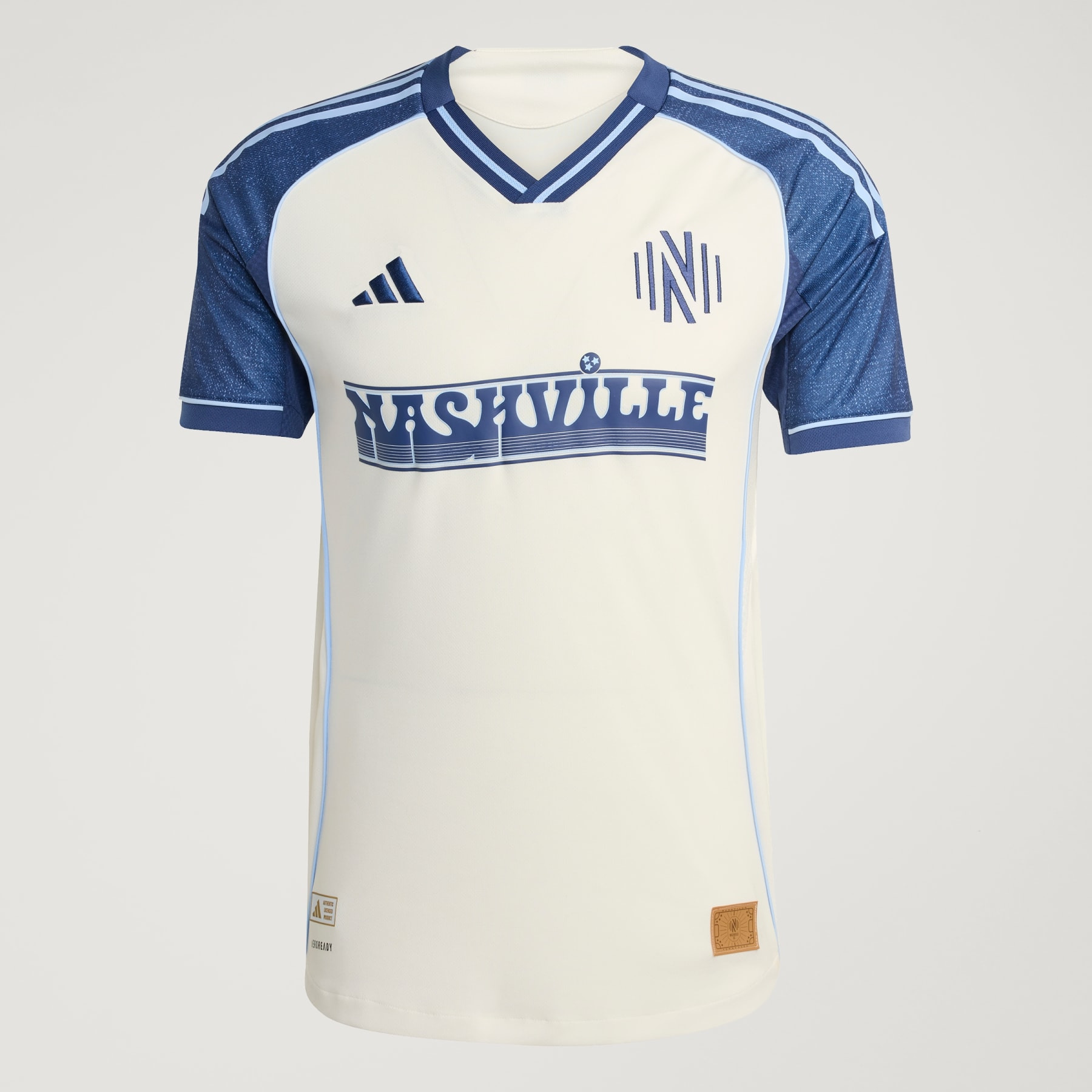 An NSC performance jersey that celebrates Nashville in '90s style. Celebrate the city that gave birth to Nashville SC. Showing off a design plucked from the adidas soccer archives, this third authentic jersey pairs country music-inspired denim-effect graphics with a team name that's styled to match the iconic neon signage above a Nashville landmark. Built for on-pitch harmony, it uses AEROREADY technology to keep players dry and focused. Details - Slim fit - V-neck - 100% polyester (recycled) - AEROREADY - Nashville SC embroidered crest - Imported - Product code: KC1247 - Product color: Chalk White