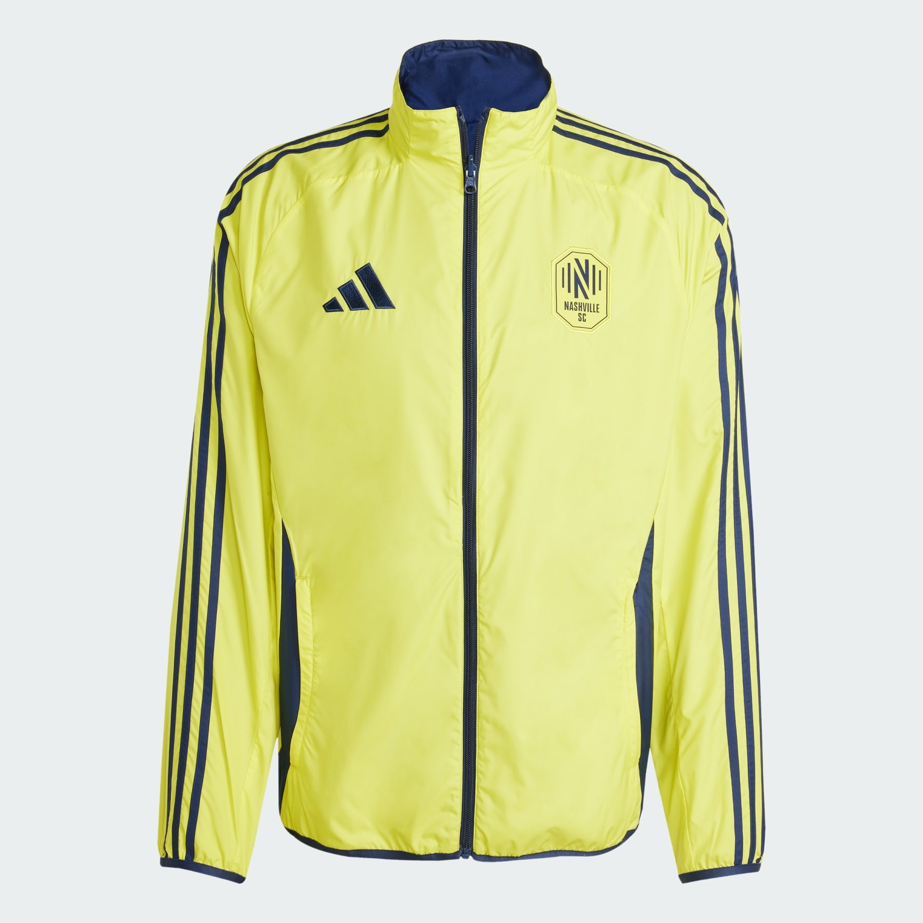 Sing for Nashville SC in an anthem jacket made with recycled materials. Wear your soccer colors with pride. The full-zip top Nashville SC players wear as they emerge from the tunnel on match days, this adidas anthem jacket has a reversible design that works with the club's home and away kits. Built from smooth ripstop fabric, it will keep you comfortable on the go. Crests on both sides mean your fandom is always on show. This product is made with 100% recycled materials. By reusing materials that have already been created, we help to reduce waste and our reliance on finite resources and reduce the footprint of the products we make. Details - Slim fit - Full zip - 100% polyester (recycled) - Lined - Outer: Nashville SC woven crest - Inner: Nashville SC screenprinted crest - Imported - Product code: JE5632 - Product color: Shock Yellow