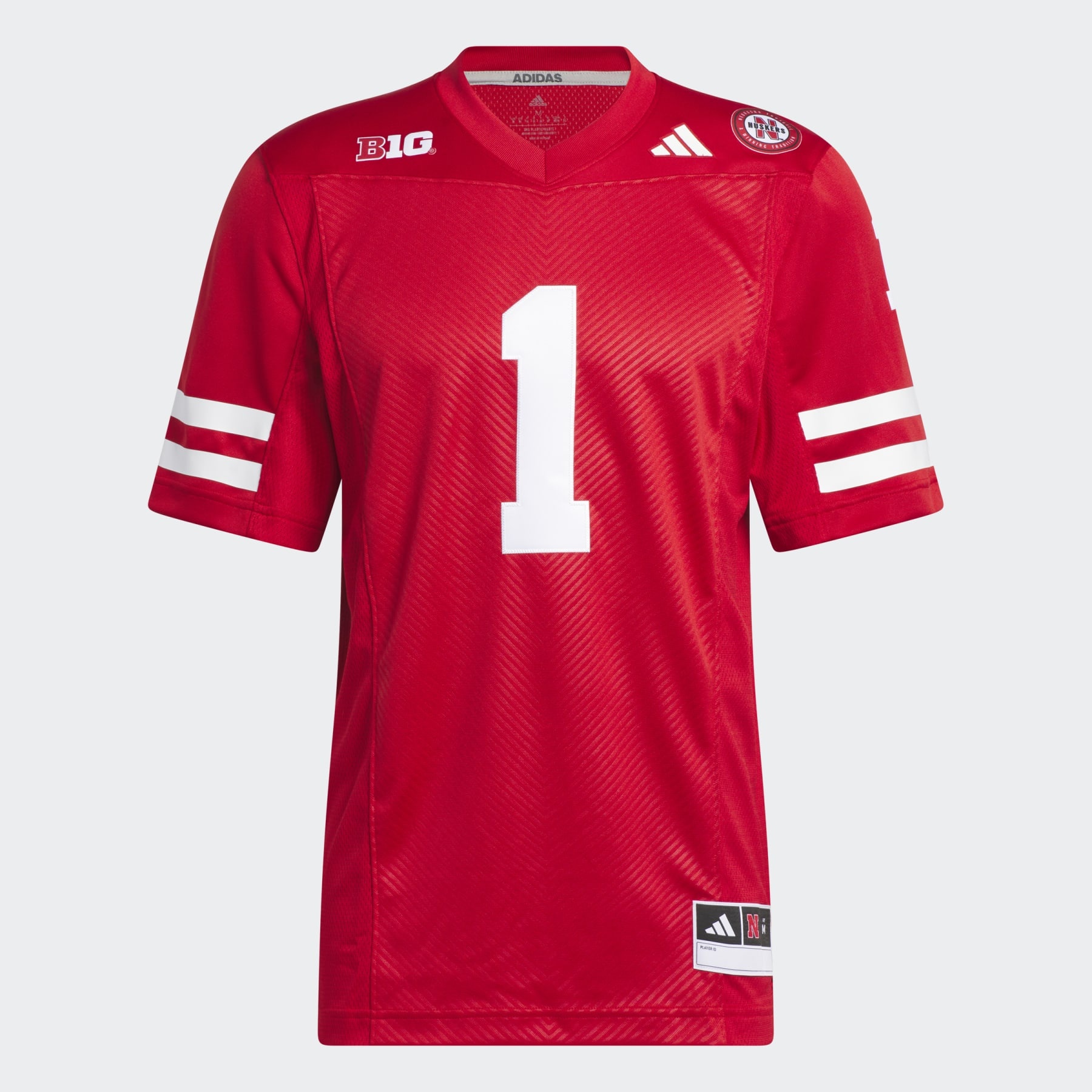 An off-field jersey for Cornhuskers fans, made with recycled materials. Get ready to root for the Cornhuskers in this adidas football jersey. It's made of comfortable fabric and has mesh panels to keep it breathable at all times. Fire up the grill or kick back with friends while you watch the game. The University of Nebraska colors let everyone know who you support.Made with 100% recycled materials, this product represents just one of our solutions to help end plastic waste. Details - Regular fit - Ribbed V-neck - Main: 100% polyester (recycled) - Shoulders and sleeves: 100% polyester (recycled) - Mesh lower sleeves and side panels - Side slits on droptail hem - Cornhuskers heat-applied crest - Number on back - Imported - Product code: IA3378 - Product color: Team Power Red