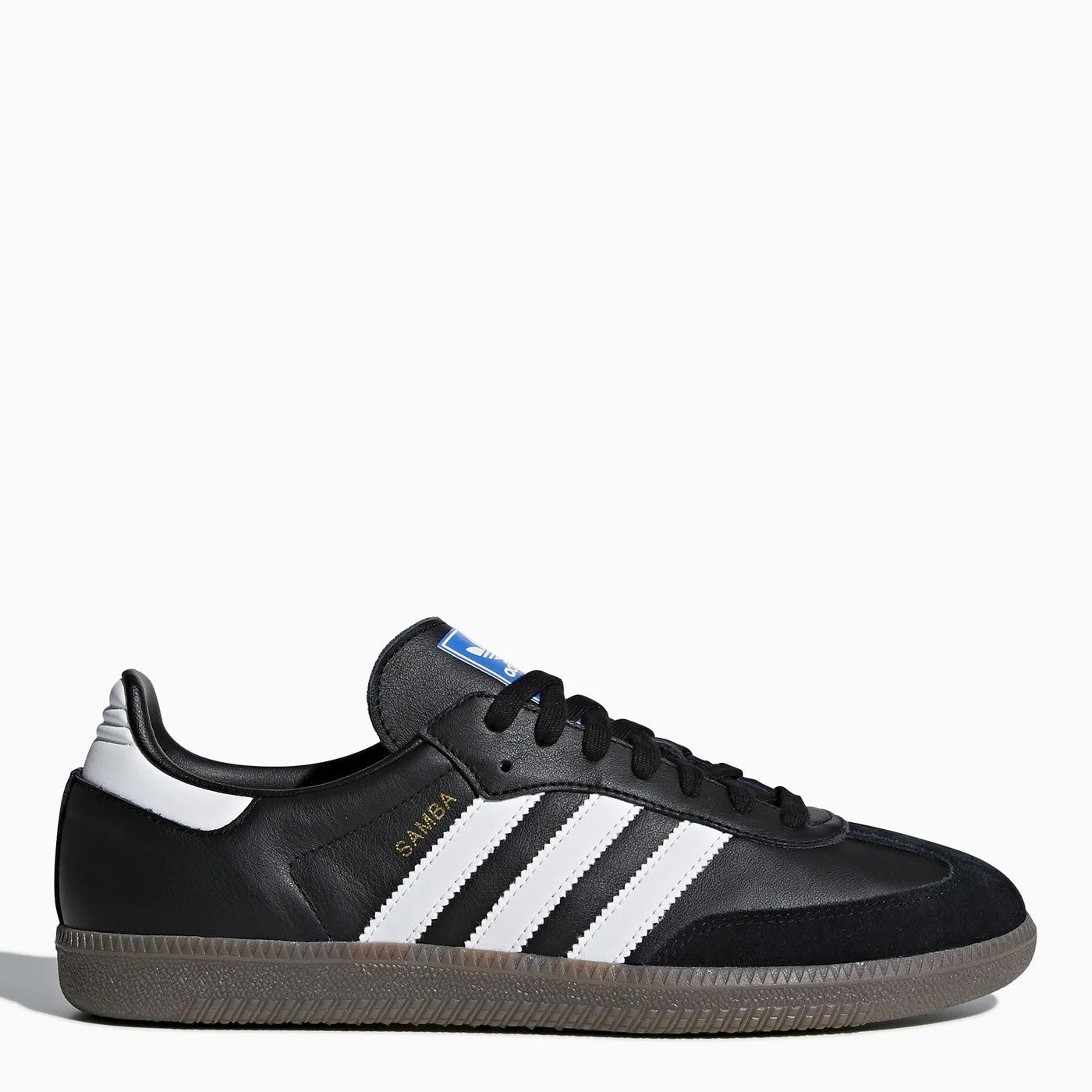 Black leather trainer from adidas Originals featuring rounded toe white side bands lace-up closure logoed tongue and natural rubber sole. Fit: buy one size larger than your usual size.