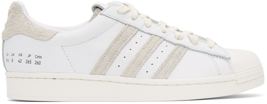 Low-top grained leather sneakers in white. Suede trim in grey throughout. Round rubber cap toe in off-white. Lace-up closure in off-white. Tonal embossed logo patch at padded tongue. Padded collar. Tonal logo embossed at heel tab. Size number stamped in black at outer heel. Signature stripes and perforated detailing at sides. Treaded rubber sole in off-white. Supplier color: Cloud white/Crystal white/ Off white