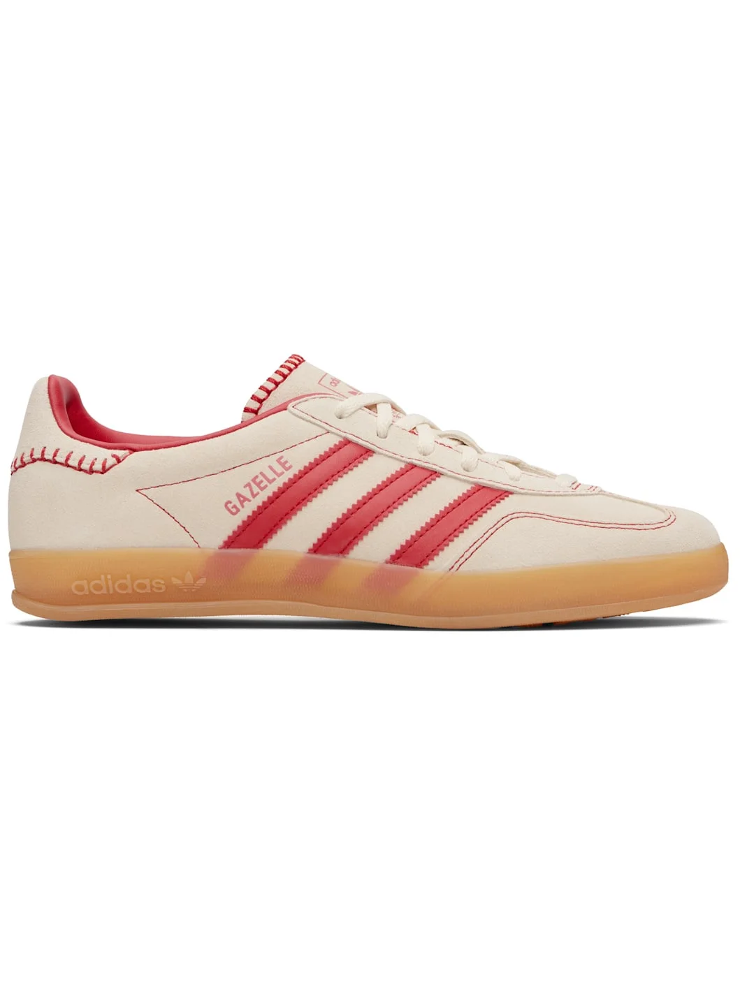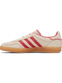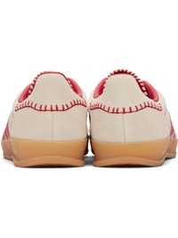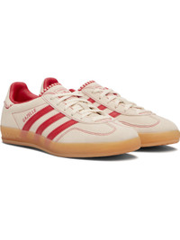 Low-top suede sneakers. · Lace-up closure · Logo stamp at tongue · Whipstitching at tongue and heel tab · Padded collar · Signature serrated stripes at sides · Text printed at outer side · Leather and faux-leather lining · Treaded rubber sole · Contrast stitching in red Supplier color: Beige/Better scarlet/Gum Upper: leather. Sole: rubber. Made in China 252751M237164