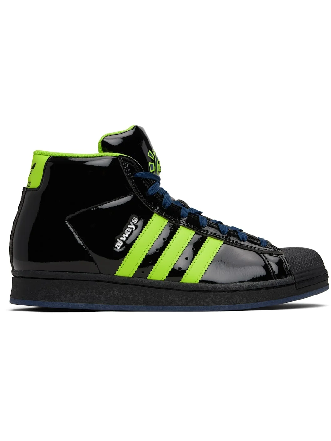 High-top patent faux-leather sneakers. · Textured rubber cap toe · Lace-up closure · Logo embossed at padded tongue · Padded collar · Signature serrated stripes and perforations at sides · Logo embossed at outer side · Logos embossed at heel · Mesh lining · Treaded rubber sole Part of the adidas Originals x always do what you should do collaboration. Supplier color: Core black/Semi solar slime/Collegiate navy Upper: synthetic. Sole: rubber. Made in Indonesia 251751M236003