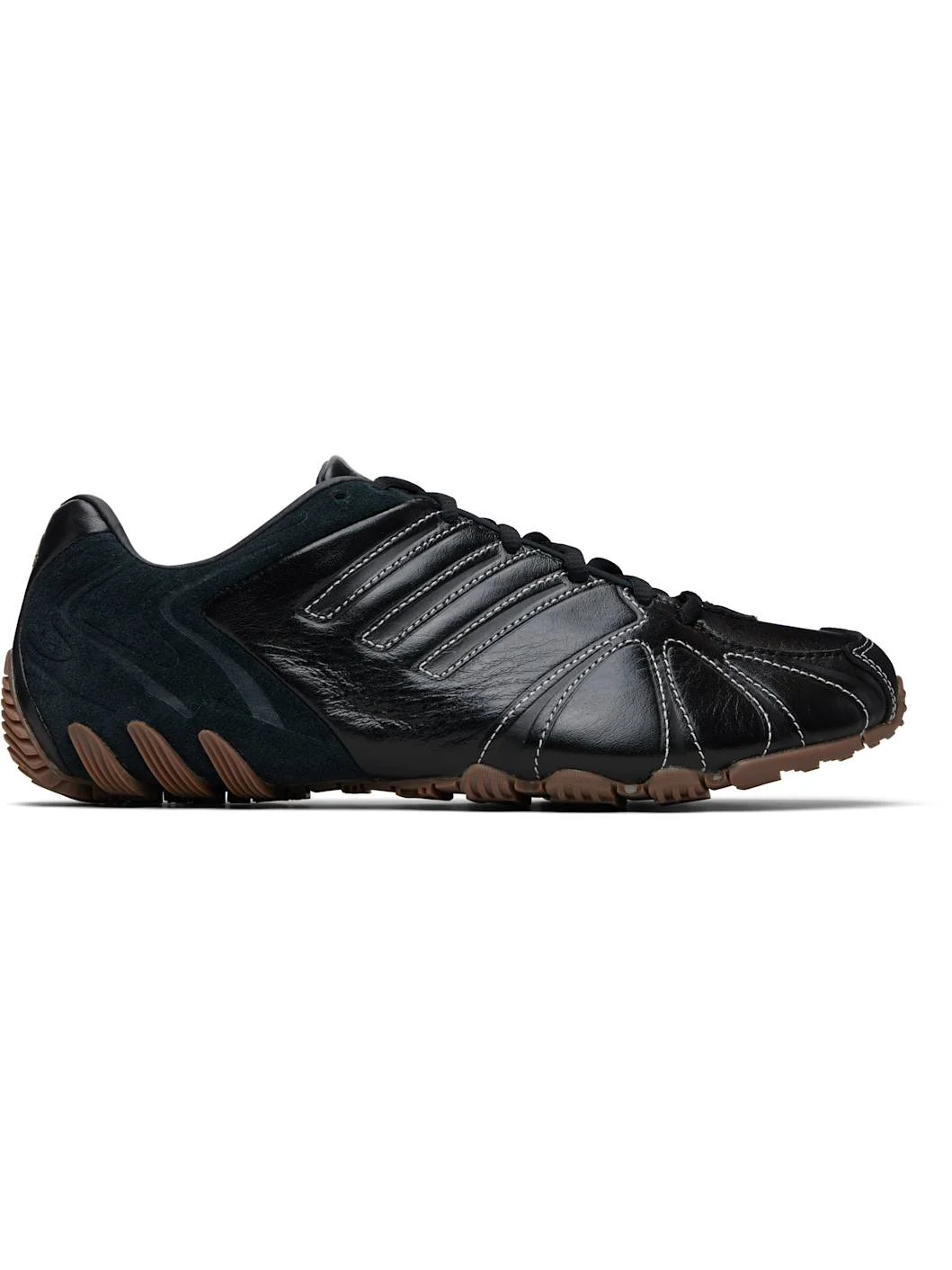 Low-top polished leather and suede sneakers. · Lace-up closure · Logo printed at tongue and heel tab · Padded collar · Buffed leather lining · Treaded rubber sole · Contrast stitching in white Supplier color: Core Black/Gum/Gold Metallic Upper: leather, synthetic, textile. Sole: rubber. Made in Viet Nam 261751M237202