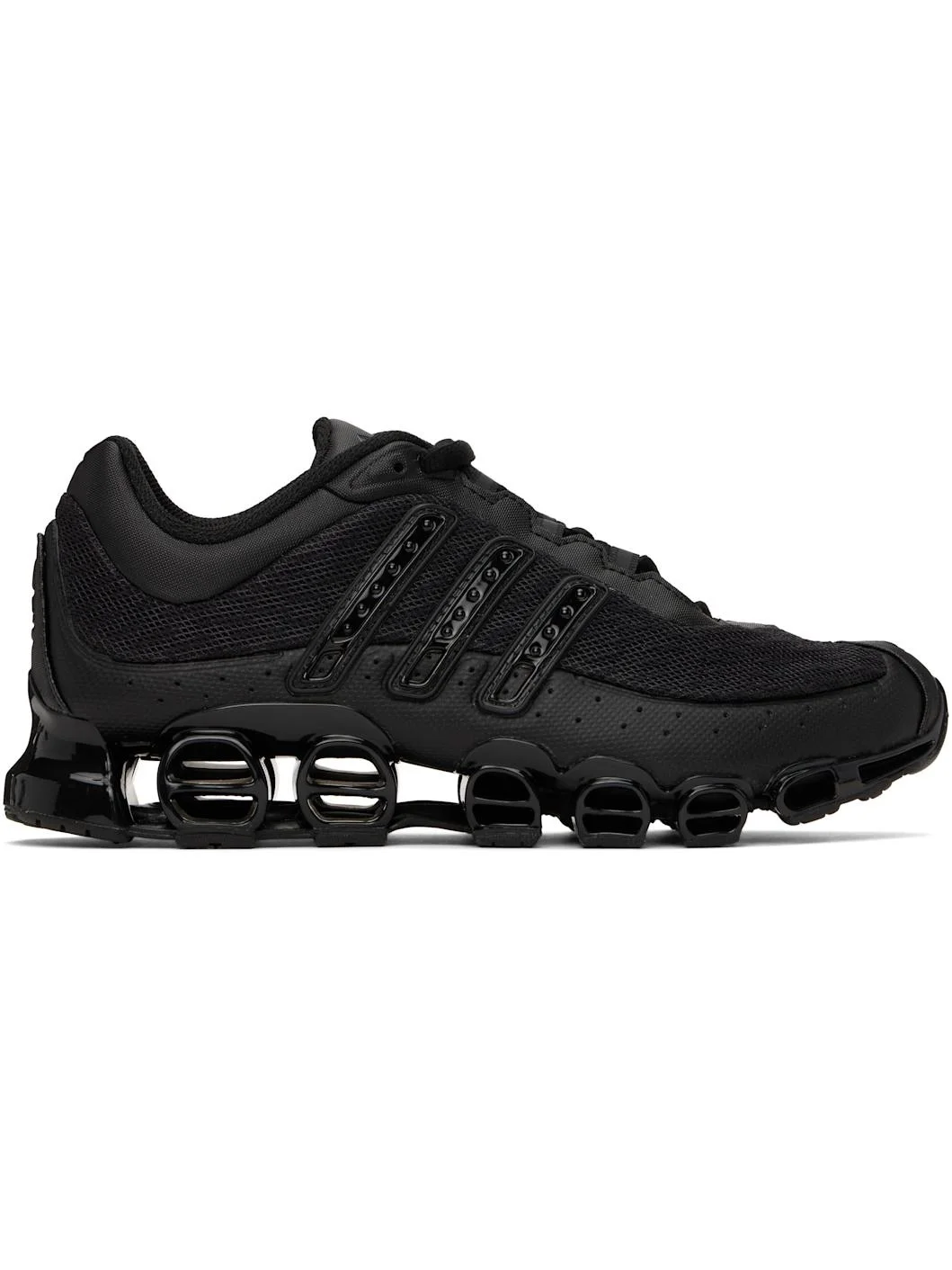 Low-top mesh sneakers in black. · Faux-leather mudguard overlays throughout · Lace-up closure · Padded neoprene tongue and collar · Logo embossed at tongue and heel counter · Signature stripes and perforations at sides · Mesh lining · Cutouts at cushioned midsole · Treaded rubber sole Supplier color: Core black/Core black/Carbon Upper: textile, synthetic. Sole: rubber. Made in Viet Nam 251751M237125