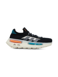 Low-top knit sneakers in black. · Lace-up closure · Logo-embossed pull-loop at tongue · Sock-style collar · Signature stripes at sides · Sculptural BOOST rubber midsole · Treaded rubber outsole Supplier color: Core black/Grey five/Off white