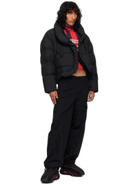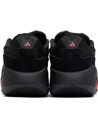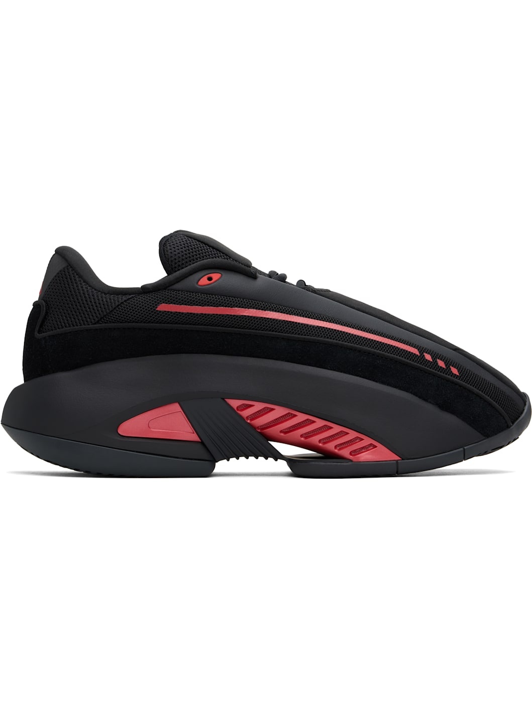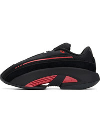 Low-top mesh, bonded jersey, suede, and buffed faux-leather sneakers in black and red. · Perforated detailing at toe · Logo bonded at vamp · Lace-up closure · Padded tongue and collar · Stripe at sides · Logo printed at heel · Jersey lining · TPU inserts at EVA foam rubber midsole · Treaded rubber sole Supplier color: Core black/Red/Core black