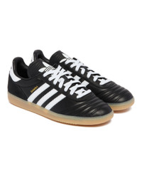 Adidas Originals Black Samba JP Sneakers. Black leather upper, classic lacing, almond-shaped toe, contrasting white side stripes, logo on the heel tab and tongue, rubber sole. Regular fit, gold Samba lettering on the sides. DETAILS Model: JQ9056BLA Composition: Upper: 100% Leather; Sole: 100% Rubber Made in: Vietnam Season: FW25-26
