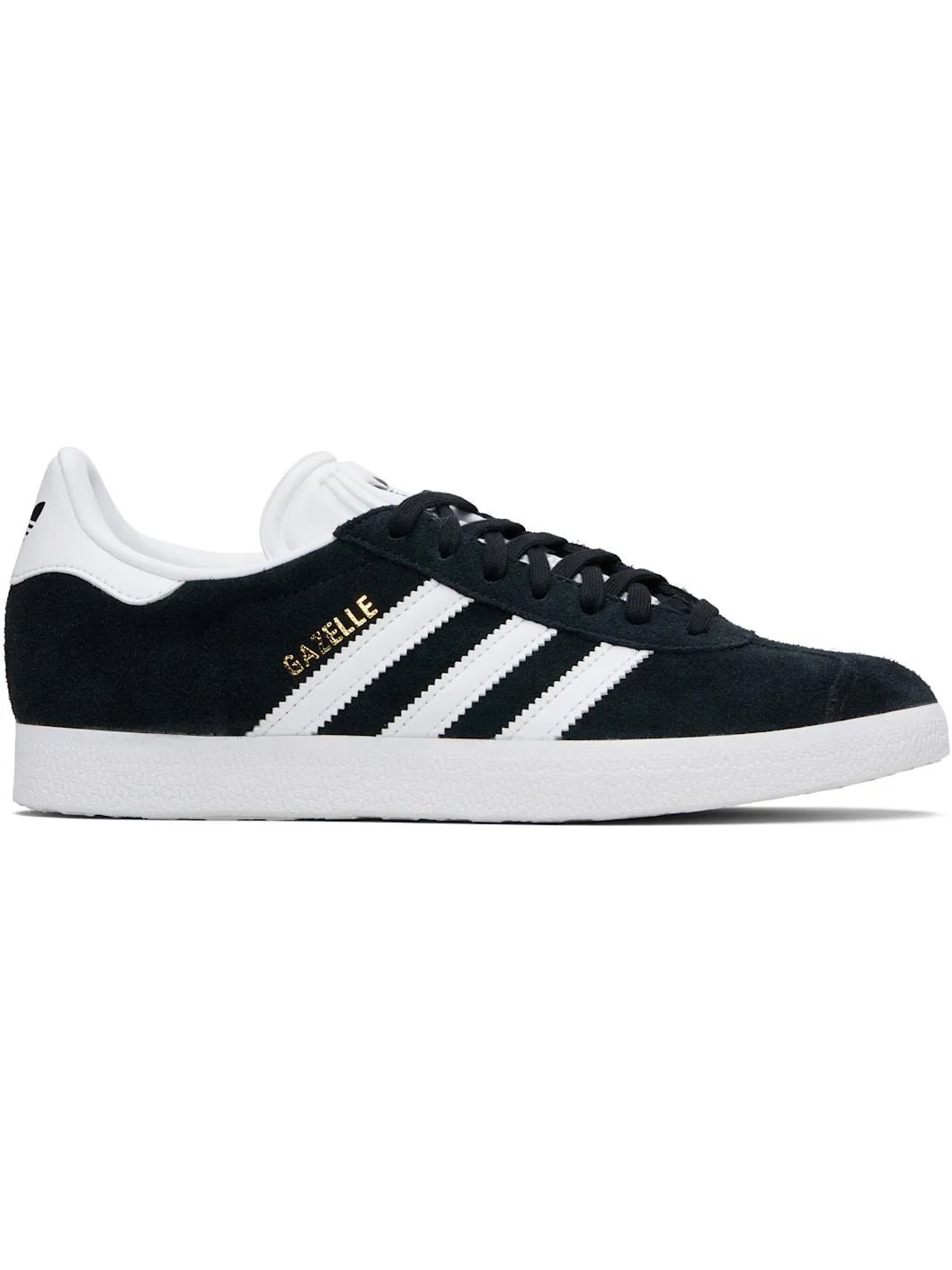 Low-top nubuck and buffed faux-leather sneakers. · Lace-up closure · Logo embossed at tongue · Padded collar · Signature serrated stripes at sides · Text stamp at outer side · Logo printed at heel tab · OrthoLite® sockliner · Treaded rubber sole Supplier color: Core black/White/Gold metallic Upper: leather, synthetic. Sole: rubber. Made in Viet Nam 252751M237162