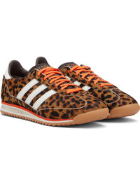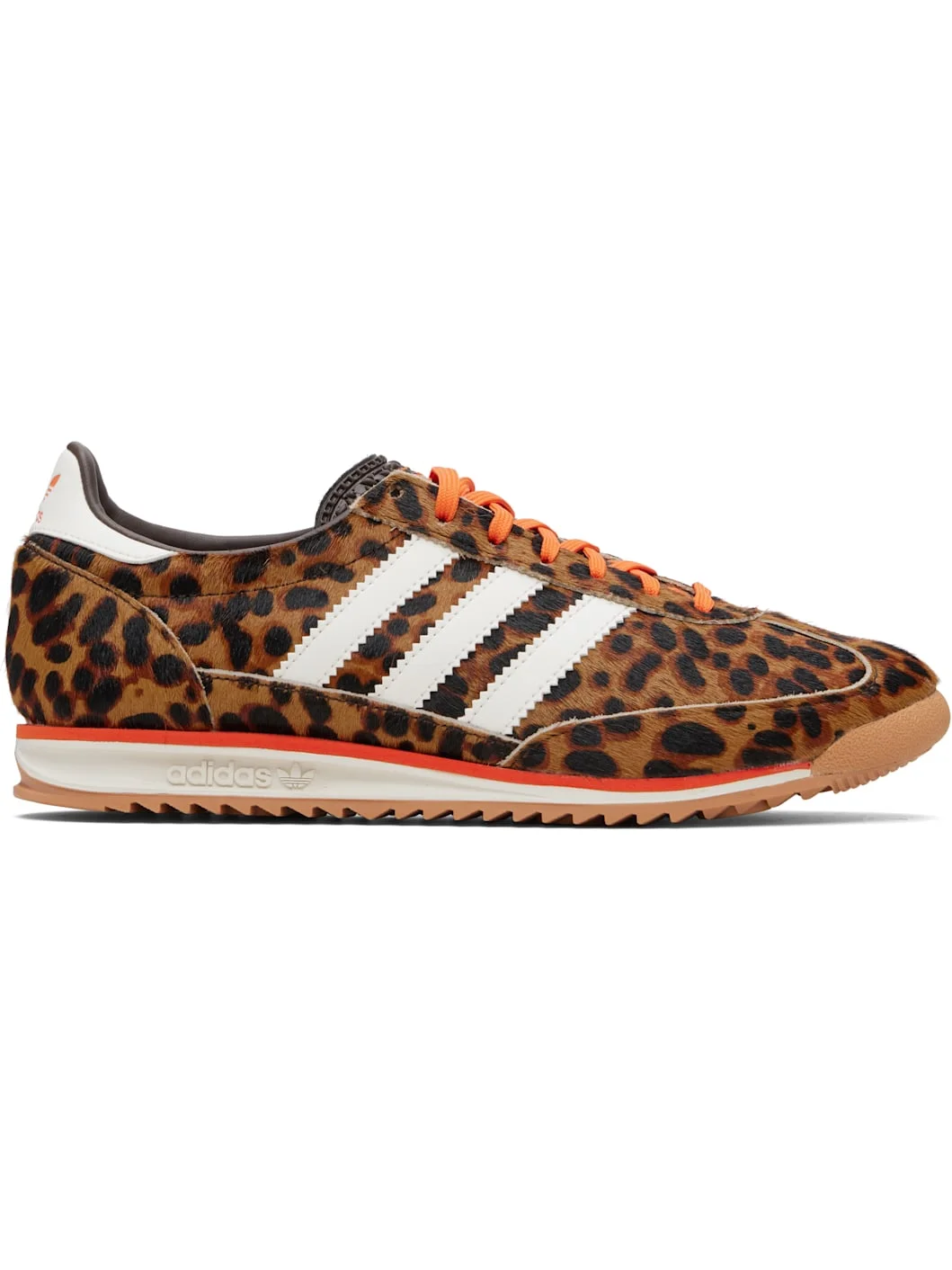 Low-top hair-on leather and buffed leather sneakers. · Leopard pattern printed throughout · Lace-up closure · Logo stamp at perforated textured tongue · Padded collar · Signature serrated stripes at sides · Logo embossed at heel tab · Buffed faux-leather lining · Logo embossed at foam rubber midsole · Treaded rubber sole Supplier color: Dark brown/Off white/Semi impact orange Upper: leather. Sole: rubber. Made in Cambodia 261751M237024