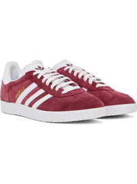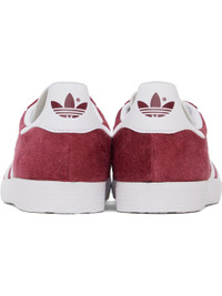 Low-top suede sneakers in burgundy and white. · Buffed faux-leather trim throughout · Lace-up closure · Logo embossed at textured tongue · Padded collar · Text bonded at outer side · Signature serrated stripes at sides · Logo printed at heel tab · Buffed faux-leather and mesh lining · Treaded rubber sole Supplier color: Collegiate burgundy/Cloud white/Gold metallic