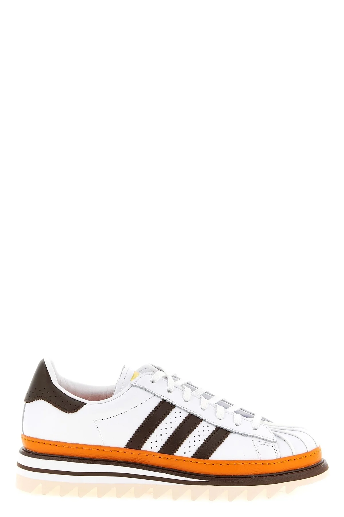 cod. KK1388WHITE 'Clot EX Orange Superstar' sneakers by Edison Chen in leather with contrasting leather heel and side stripes, 'Unity Orange' hammered leather edging, clamshell toe with finely worked and hand-sewn ribs in first choice leather, embossed logo on the tongue, laces closure, layered midsole, notched rubber sole. Color: Brown Composition: 100% calfskin leather (Bos Taurus) Made in: China PROMO CODE NOT APPLICABLE