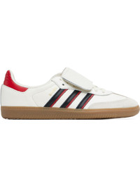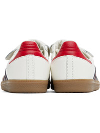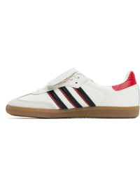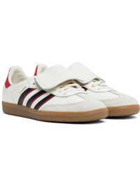 Low-top grained leather sneakers in off-white. · Suede trim at toe · Lace-up closure · Logo embossed at extended foldover tongue · Padded collar · Signature serrated stripes at sides · Text printed at outer side · Quilted heel tab · Grained leather and mesh lining · Treaded rubber sole Supplier color: Cloud white/Core black/Better scarlet Upper: leather. Sole: rubber. Made in Viet Nam 251751M237067
