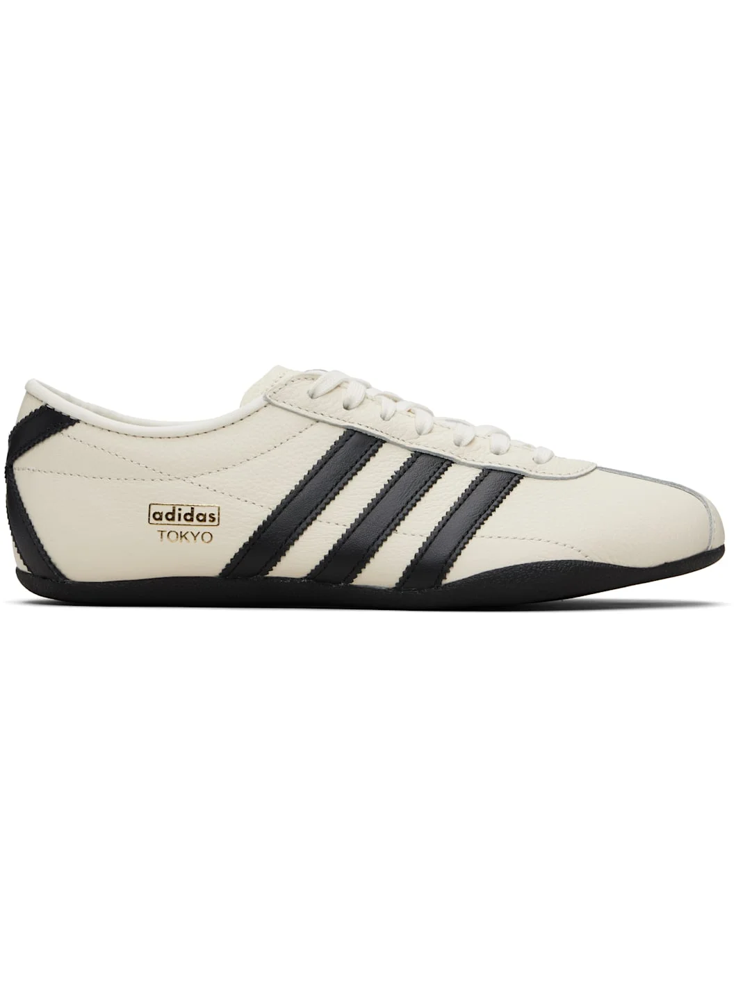 Low-top grained leather sneakers. · Lace-up closure · Logo stamp at tongue and outer side · Padded collar · Signature serrated stripes at sides and heel · Buffed leather lining · Crepe-rubber sole Supplier color: Off white/Core black Upper: leather. Sole: rubber. Made in Viet Nam 261751M237051