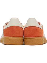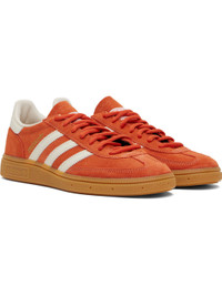 Low-top faux-suede sneakers in orange and white. · Buffed faux-leather trim throughout · Lace-up closure · Logo patch at tongue · Padded tongue and collar · Text bonded at outer side · Signature serrated stripes at sides · Buffed faux-leather and mesh lining · Logo embossed at treaded rubber sole · Contrast stitching in pink Supplier color: Preloved red/Cream white/Crystal white Upper: synthetic. Sole: rubber. Made in Viet Nam 251751M237147