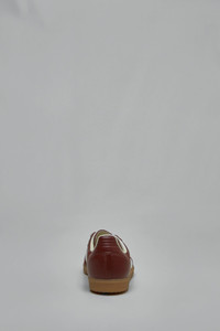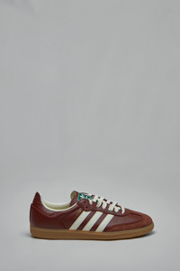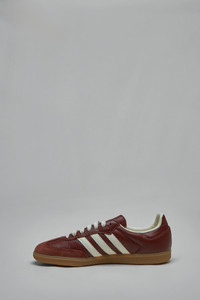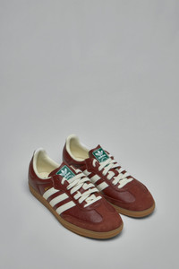 Low top sneakers in textured burgundy leather with white three-stripe branding and a gum rubber sole. Design includes white laces, a green trefoil tongue label and gold SAMBA lettering on the side. Materials: Leather upper, textile lining, EVA midsole Color: fox brown / off white / gum SKU: 153603 Brand style: JR0892