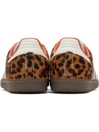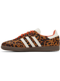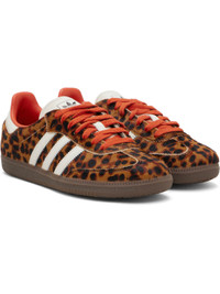 Low-top hair-on leather and buffed leather sneakers. · Leopard pattern printed throughout · Lace-up closure · Logo stamp at tongue · Padded collar · Signature serrated stripes at sides · Quilting at heel tab · Treaded rubber sole Supplier color: Core black/Preloved red/Cream white Upper: leather. Sole: rubber. Made in Viet Nam 261751M237025